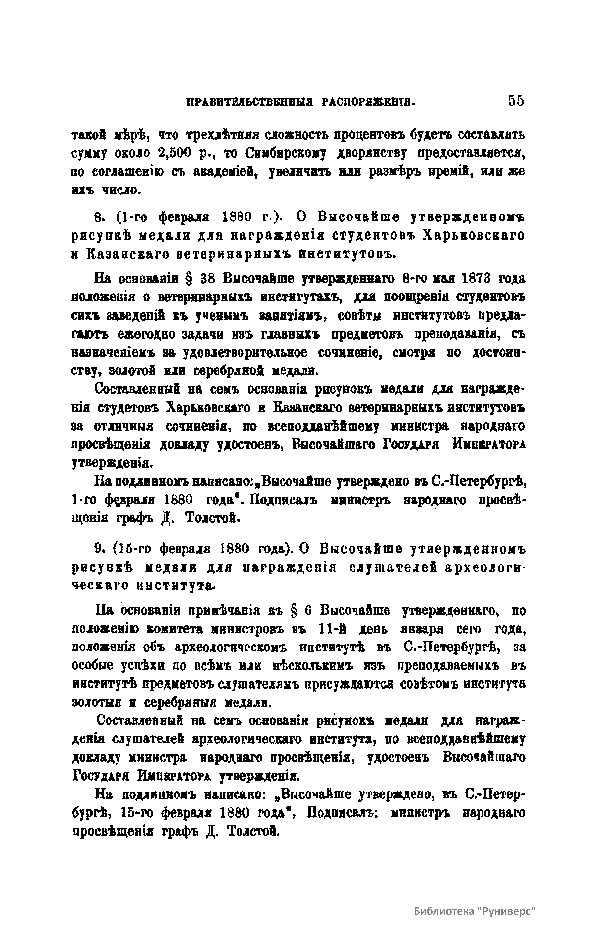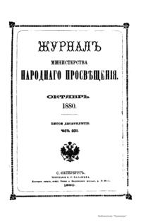 Журнал Министерства народного просвещения выходил с 1834-го по 1917 год. Официальный периодический журнал об успехах просвещения в России. Издатели журнала уверены в том, что «если для каждого человека необходим выход из грубой тьмы невежества и беспрерывное дальнейшее движение к свету, то для народов необходимо попечительное участие правительства в образовании. Только правительство имеет все средства знать и высоту успехов всемирного образования, и настоящие нужды Отечества».