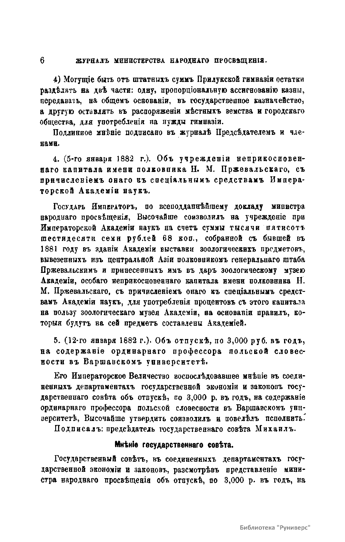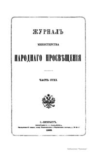 Журнал Министерства народного просвещения выходил с 1834-го по 1917 год. Официальный периодический журнал об успехах просвещения в России. Издатели журнала уверены в том, что «если для каждого человека необходим выход из грубой тьмы невежества и беспрерывное дальнейшее движение к свету, то для народов необходимо попечительное участие правительства в образовании. Только правительство имеет все средства знать и высоту успехов всемирного образования, и настоящие нужды Отечества».