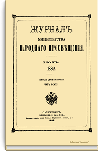 Журнал Министерства народного просвещения выходил с 1834-го по 1917 год. Официальный периодический журнал об успехах просвещения в России. Издатели журнала уверены в том, что «если для каждого человека необходим выход из грубой тьмы невежества и беспрерывное дальнейшее движение к свету, то для народов необходимо попечительное участие правительства в образовании. Только правительство имеет все средства знать и высоту успехов всемирного образования, и настоящие нужды Отечества».