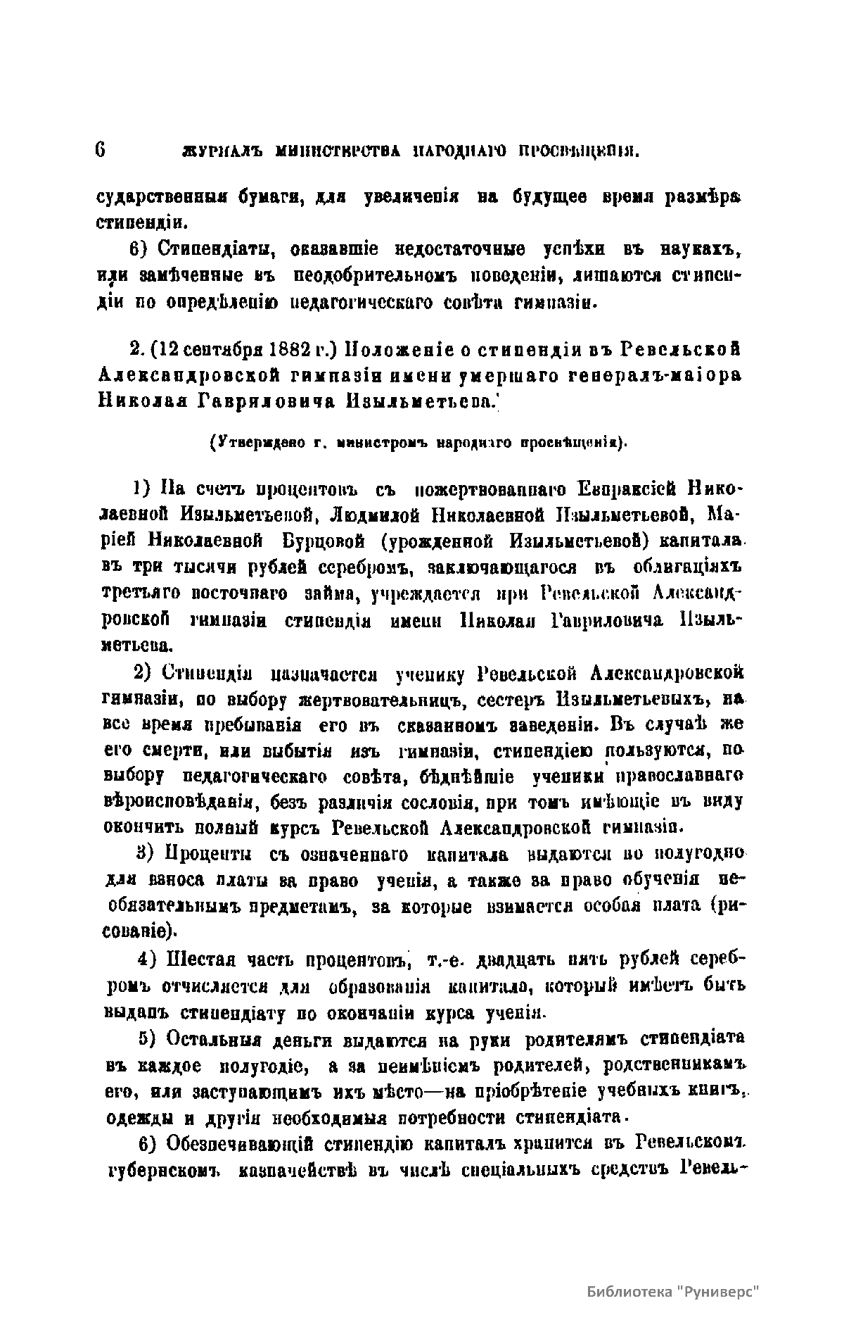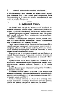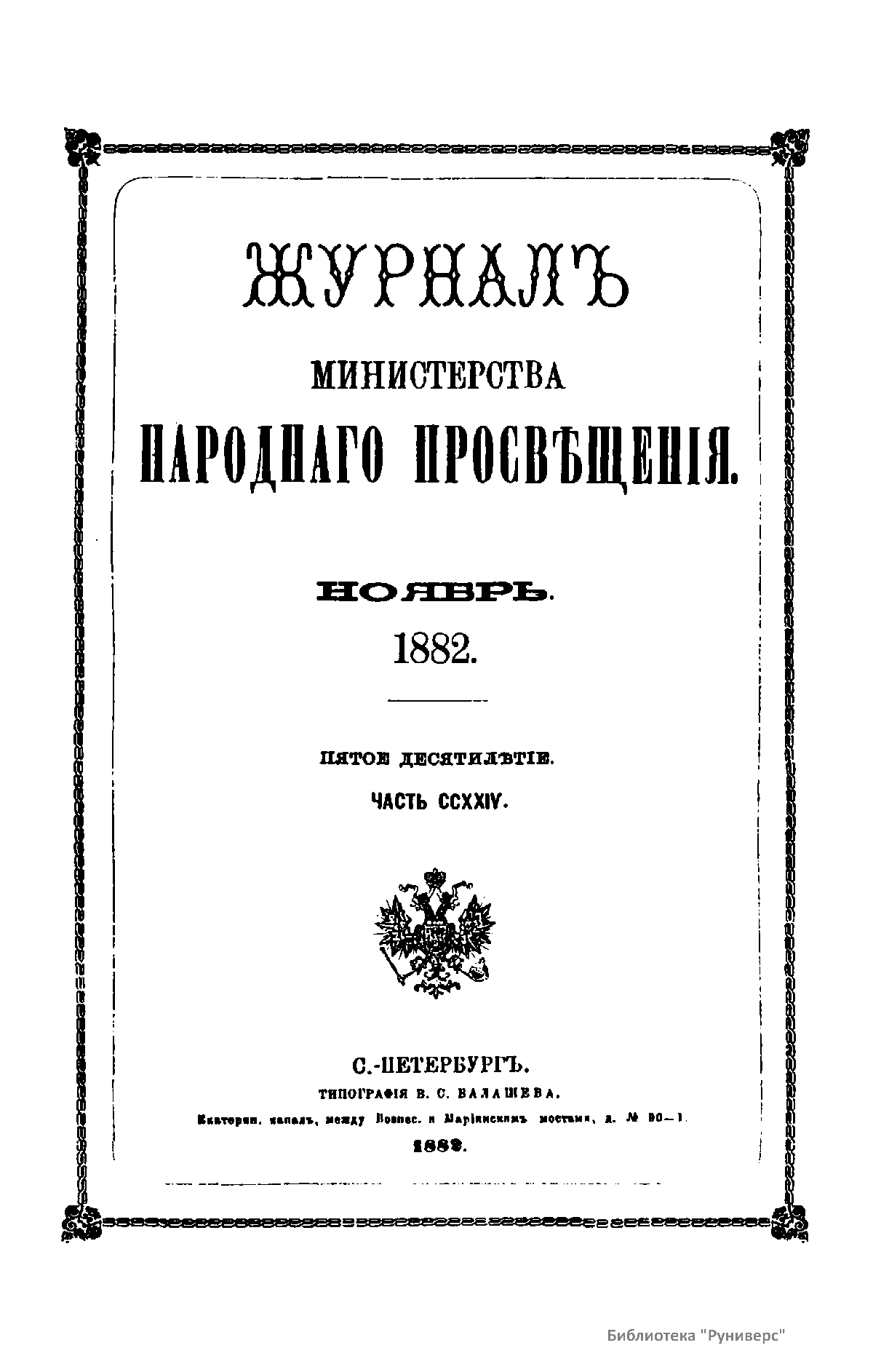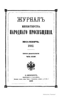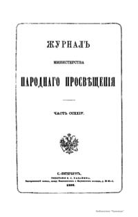 Журнал Министерства народного просвещения выходил с 1834-го по 1917 год. Официальный периодический журнал об успехах просвещения в России. Издатели журнала уверены в том, что «если для каждого человека необходим выход из грубой тьмы невежества и беспрерывное дальнейшее движение к свету, то для народов необходимо попечительное участие правительства в образовании. Только правительство имеет все средства знать и высоту успехов всемирного образования, и настоящие нужды Отечества».