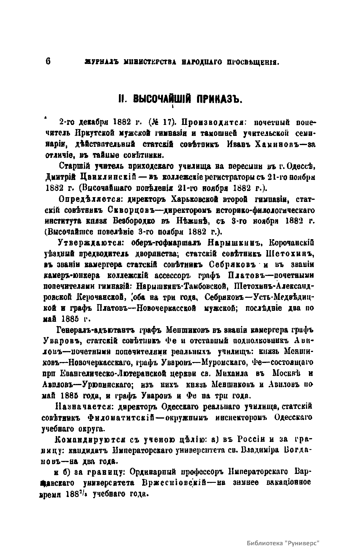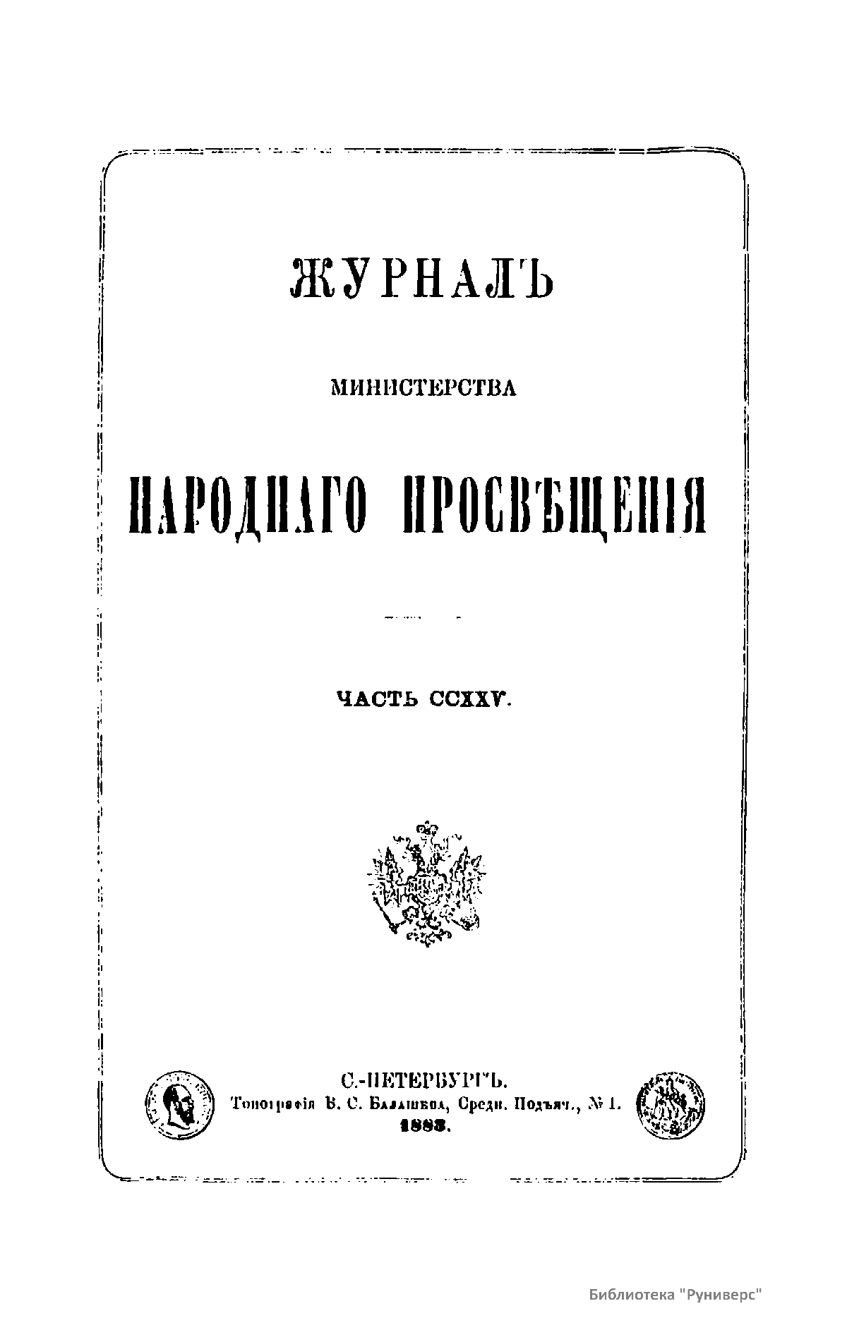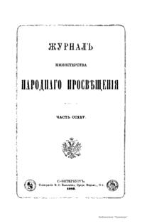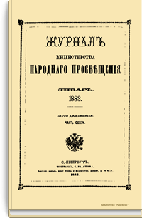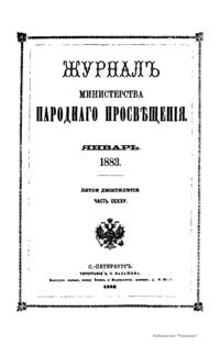 Журнал Министерства народного просвещения выходил с 1834-го по 1917 год. Официальный периодический журнал об успехах просвещения в России. Издатели журнала уверены в том, что «если для каждого человека необходим выход из грубой тьмы невежества и беспрерывное дальнейшее движение к свету, то для народов необходимо попечительное участие правительства в образовании. Только правительство имеет все средства знать и высоту успехов всемирного образования, и настоящие нужды Отечества».