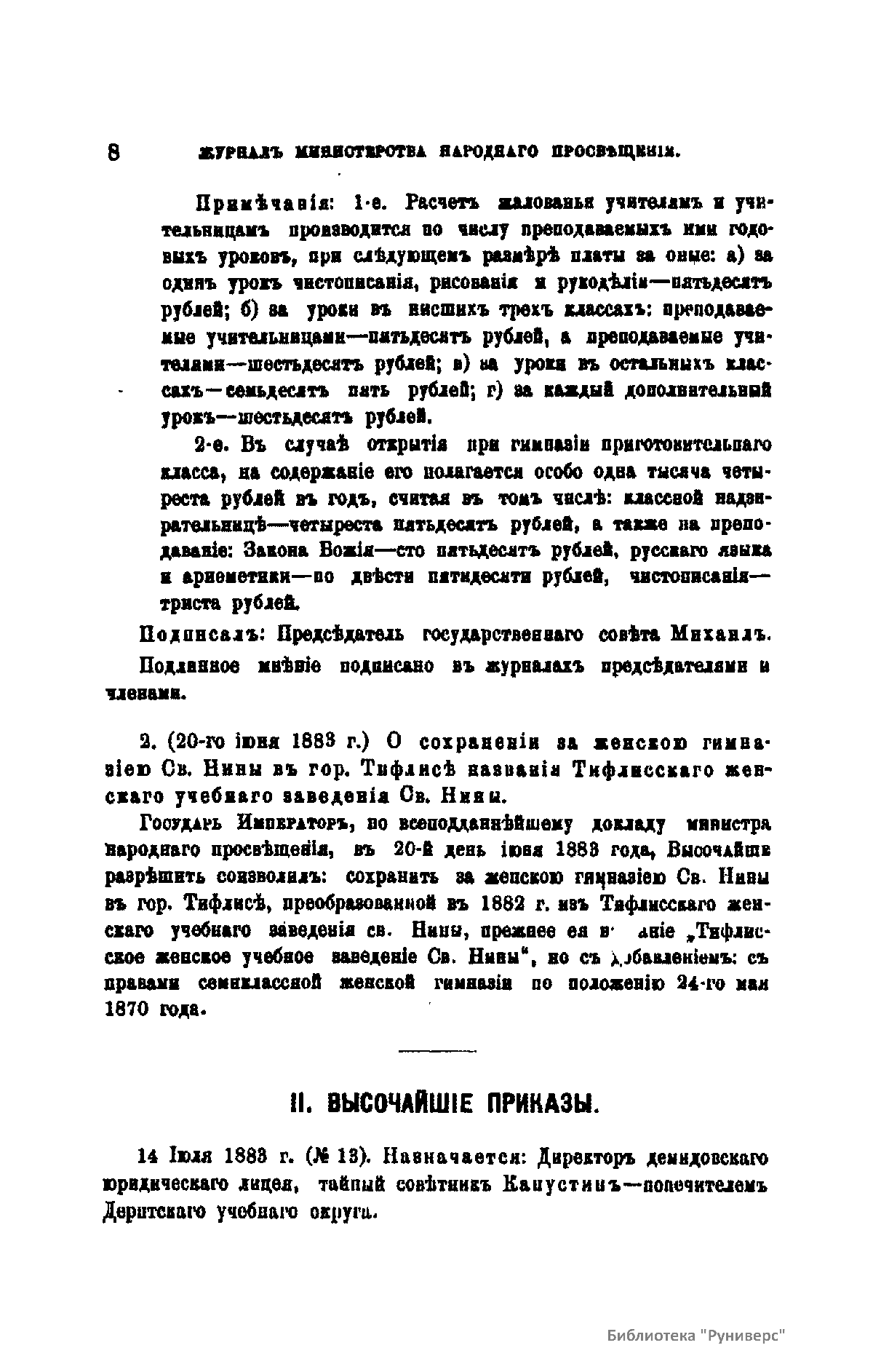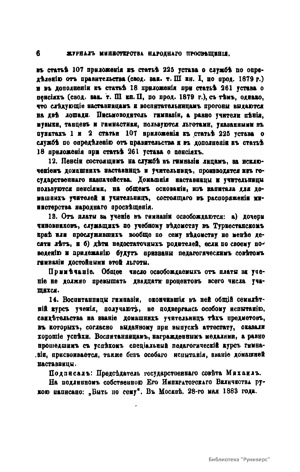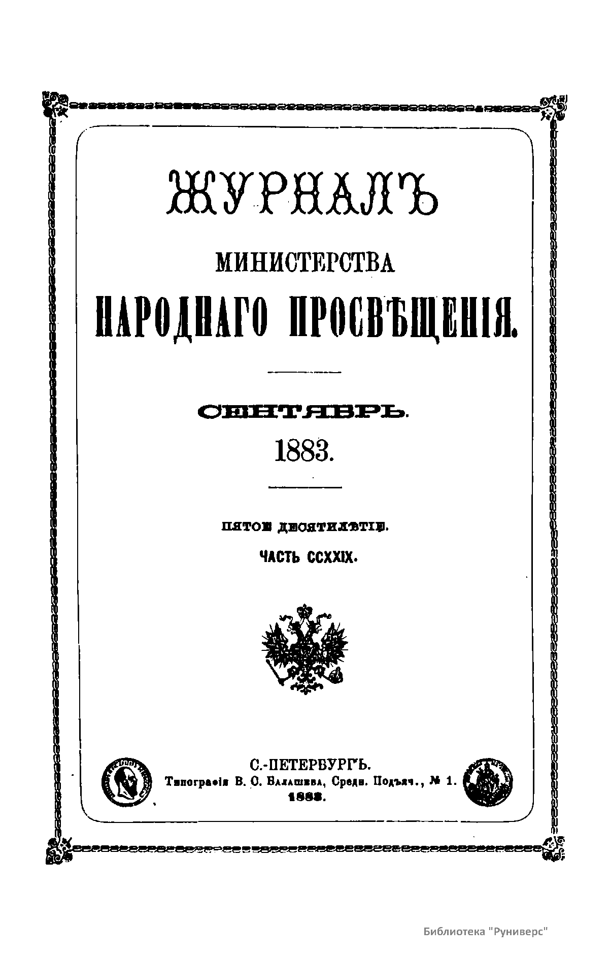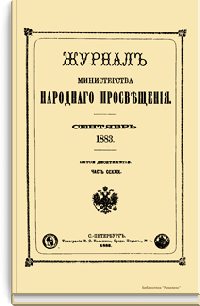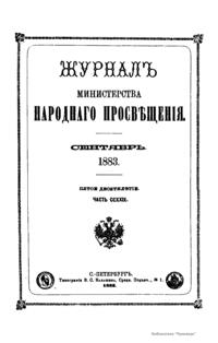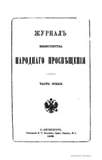 Журнал Министерства народного просвещения выходил с 1834-го по 1917 год. Официальный периодический журнал об успехах просвещения в России. Издатели журнала уверены в том, что «если для каждого человека необходим выход из грубой тьмы невежества и беспрерывное дальнейшее движение к свету, то для народов необходимо попечительное участие правительства в образовании. Только правительство имеет все средства знать и высоту успехов всемирного образования, и настоящие нужды Отечества».