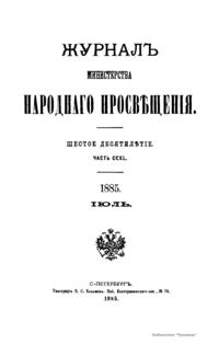 Журнал Министерства народного просвещения выходил с 1834-го по 1917 год. Официальный периодический журнал об успехах просвещения в России. Издатели журнала уверены в том, что «если для каждого человека необходим выход из грубой тьмы невежества и беспрерывное дальнейшее движение к свету, то для народов необходимо попечительное участие правительства в образовании. Только правительство имеет все средства знать и высоту успехов всемирного образования, и настоящие нужды Отечества».