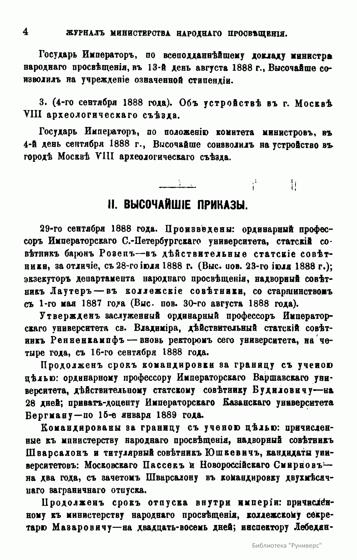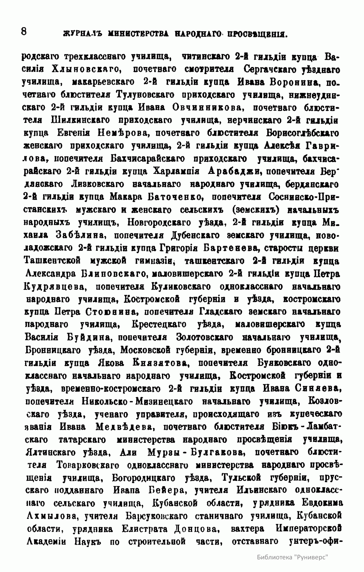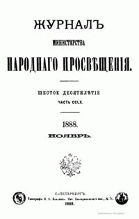 Журнал Министерства народного просвещения выходил с 1834-го по 1917 год. Официальный периодический журнал об успехах просвещения в России. Издатели журнала уверены в том, что «если для каждого человека необходим выход из грубой тьмы невежества и беспрерывное дальнейшее движение к свету, то для народов необходимо попечительное участие правительства в образовании. Только правительство имеет все средства знать и высоту успехов всемирного образования, и настоящие нужды Отечества».