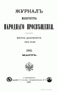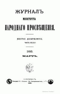 Журнал Министерства народного просвещения выходил с 1834-го по 1917 год. Официальный периодический журнал об успехах просвещения в России. Издатели журнала уверены в том, что «если для каждого человека необходим выход из грубой тьмы невежества и беспрерывное дальнейшее движение к свету, то для народов необходимо попечительное участие правительства в образовании. Только правительство имеет все средства знать и высоту успехов всемирного образования, и настоящие нужды Отечества».