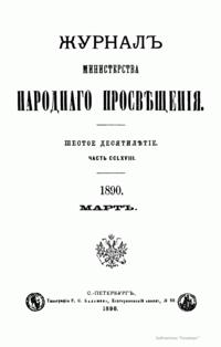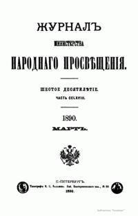Журнал Министерства народного просвещения выходил с 1834-го по 1917 год. Официальный периодический журнал об успехах просвещения в России. Издатели журнала уверены в том, что «если для каждого человека необходим выход из грубой тьмы невежества и беспрерывное дальнейшее движение к свету, то для народов необходимо попечительное участие правительства в образовании. Только правительство имеет все средства знать и высоту успехов всемирного образования, и настоящие нужды Отечества».