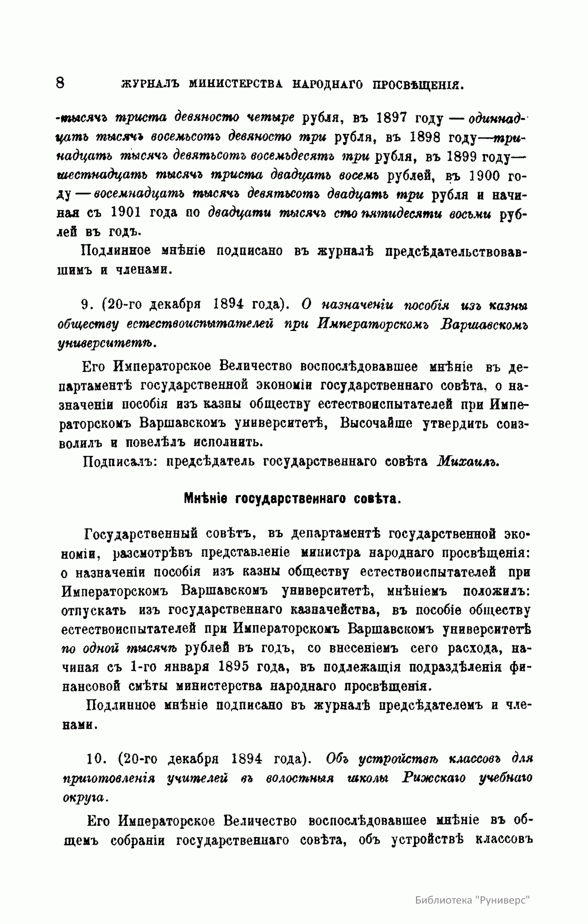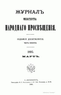 Журнал Министерства народного просвещения выходил с 1834-го по 1917 год. Официальный периодический журнал об успехах просвещения в России. Издатели журнала уверены в том, что «если для каждого человека необходим выход из грубой тьмы невежества и беспрерывное дальнейшее движение к свету, то для народов необходимо попечительное участие правительства в образовании. Только правительство имеет все средства знать и высоту успехов всемирного образования, и настоящие нужды Отечества».
