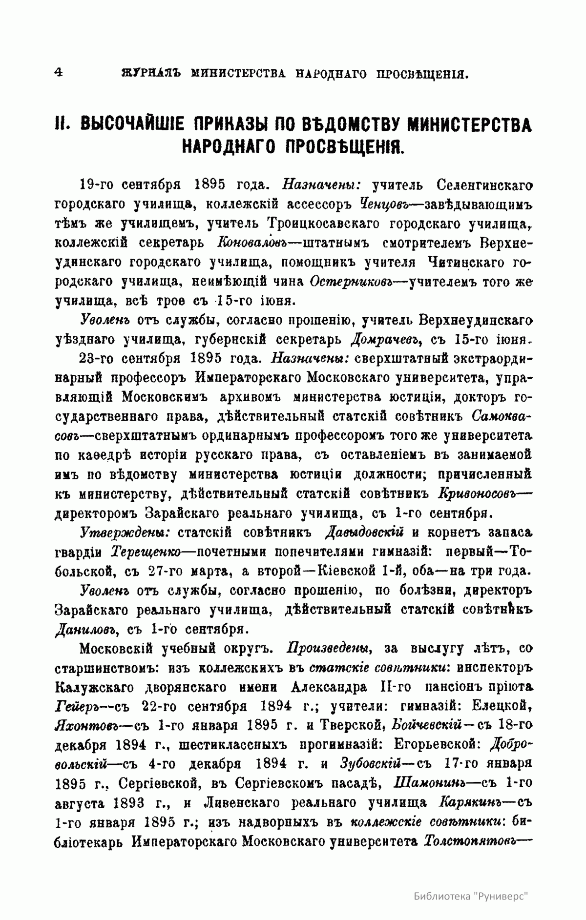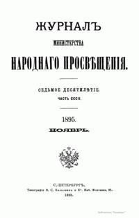 Журнал Министерства народного просвещения выходил с 1834-го по 1917 год. Официальный периодический журнал об успехах просвещения в России. Издатели журнала уверены в том, что «если для каждого человека необходим выход из грубой тьмы невежества и беспрерывное дальнейшее движение к свету, то для народов необходимо попечительное участие правительства в образовании. Только правительство имеет все средства знать и высоту успехов всемирного образования, и настоящие нужды Отечества».
