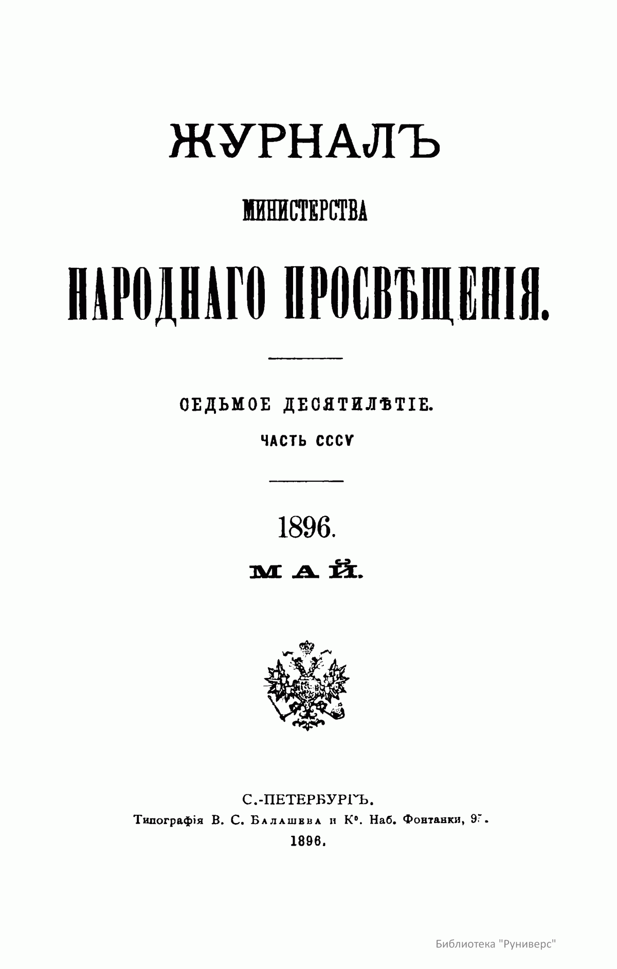 Журнал Министерства народного просвещения выходил с 1834-го по 1917 год. Официальный периодический журнал об успехах просвещения в России. Издатели журнала уверены в том, что «если для каждого человека необходим выход из грубой тьмы невежества и беспрерывное дальнейшее движение к свету, то для народов необходимо попечительное участие правительства в образовании. Только правительство имеет все средства знать и высоту успехов всемирного образования, и настоящие нужды Отечества».