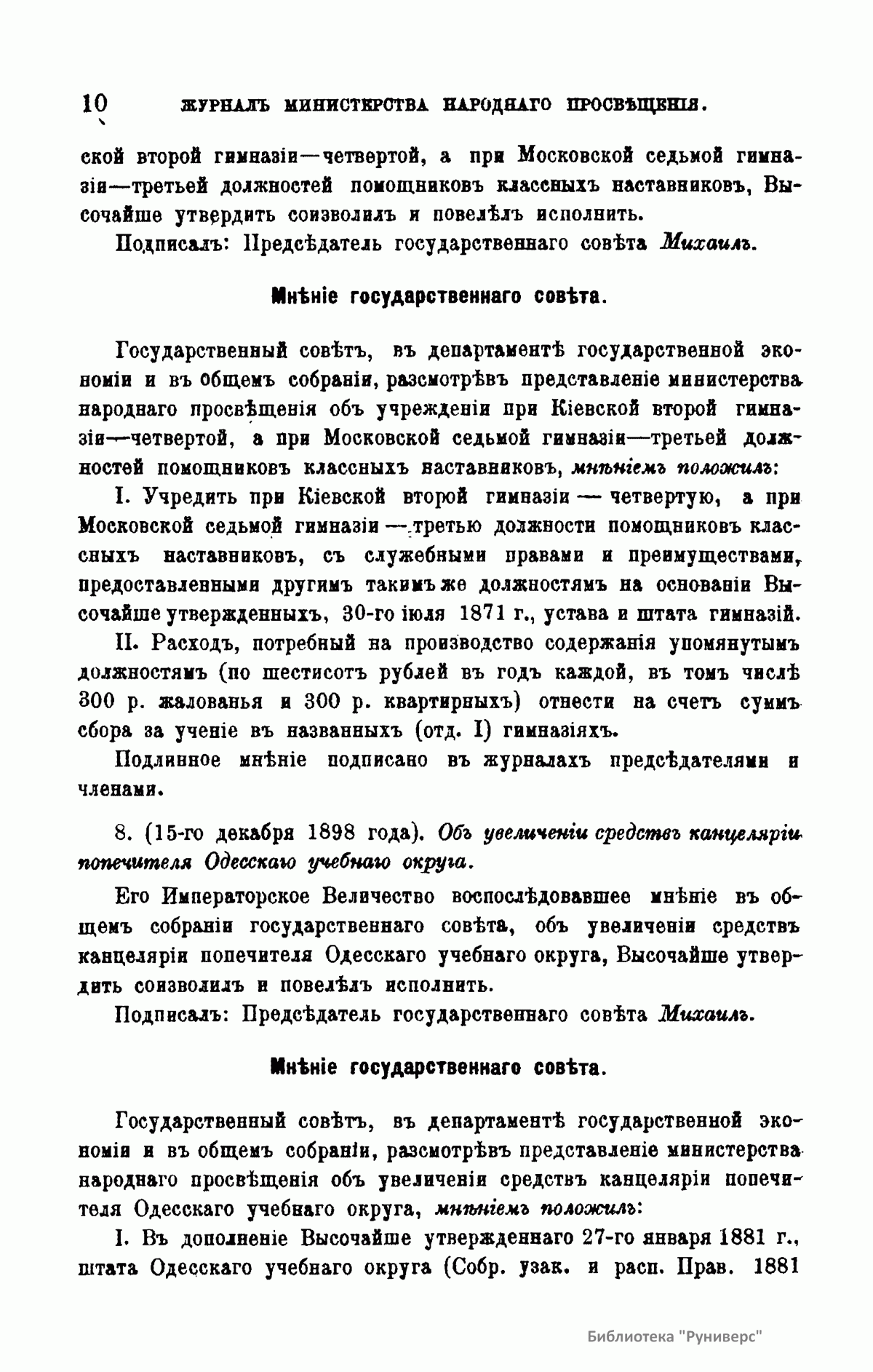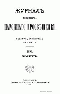 Журнал Министерства народного просвещения выходил с 1834-го по 1917 год. Официальный периодический журнал об успехах просвещения в России. Издатели журнала уверены в том, что «если для каждого человека необходим выход из грубой тьмы невежества и беспрерывное дальнейшее движение к свету, то для народов необходимо попечительное участие правительства в образовании. Только правительство имеет все средства знать и высоту успехов всемирного образования, и настоящие нужды Отечества».