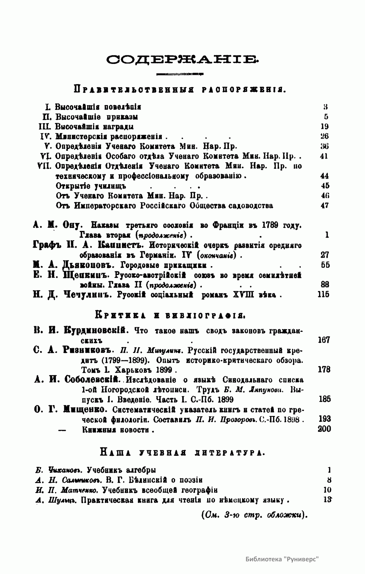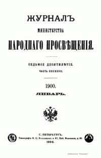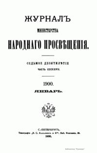 Журнал Министерства народного просвещения выходил с 1834-го по 1917 год. Официальный периодический журнал об успехах просвещения в России. Издатели журнала уверены в том, что «если для каждого человека необходим выход из грубой тьмы невежества и беспрерывное дальнейшее движение к свету, то для народов необходимо попечительное участие правительства в образовании. Только правительство имеет все средства знать и высоту успехов всемирного образования, и настоящие нужды Отечества».