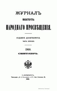 Журнал Министерства народного просвещения выходил с 1834-го по 1917 год. Официальный периодический журнал об успехах просвещения в России. Издатели журнала уверены в том, что «если для каждого человека необходим выход из грубой тьмы невежества и беспрерывное дальнейшее движение к свету, то для народов необходимо попечительное участие правительства в образовании. Только правительство имеет все средства знать и высоту успехов всемирного образования, и настоящие нужды Отечества».