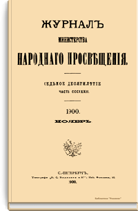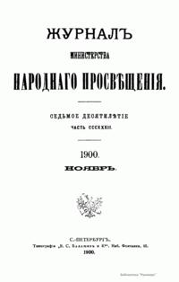 Журнал Министерства народного просвещения выходил с 1834-го по 1917 год. Официальный периодический журнал об успехах просвещения в России. Издатели журнала уверены в том, что «если для каждого человека необходим выход из грубой тьмы невежества и беспрерывное дальнейшее движение к свету, то для народов необходимо попечительное участие правительства в образовании. Только правительство имеет все средства знать и высоту успехов всемирного образования, и настоящие нужды Отечества».