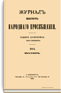 Журнал Министерства народного просвещения выходил с 1834-го по 1917 год. Официальный периодический журнал об успехах просвещения в России. Издатели журнала уверены в том, что «если для каждого человека необходим выход из грубой тьмы невежества и беспрерывное дальнейшее движение к свету, то для народов необходимо попечительное участие правительства в образовании. Только правительство имеет все средства знать и высоту успехов всемирного образования, и настоящие нужды Отечества».