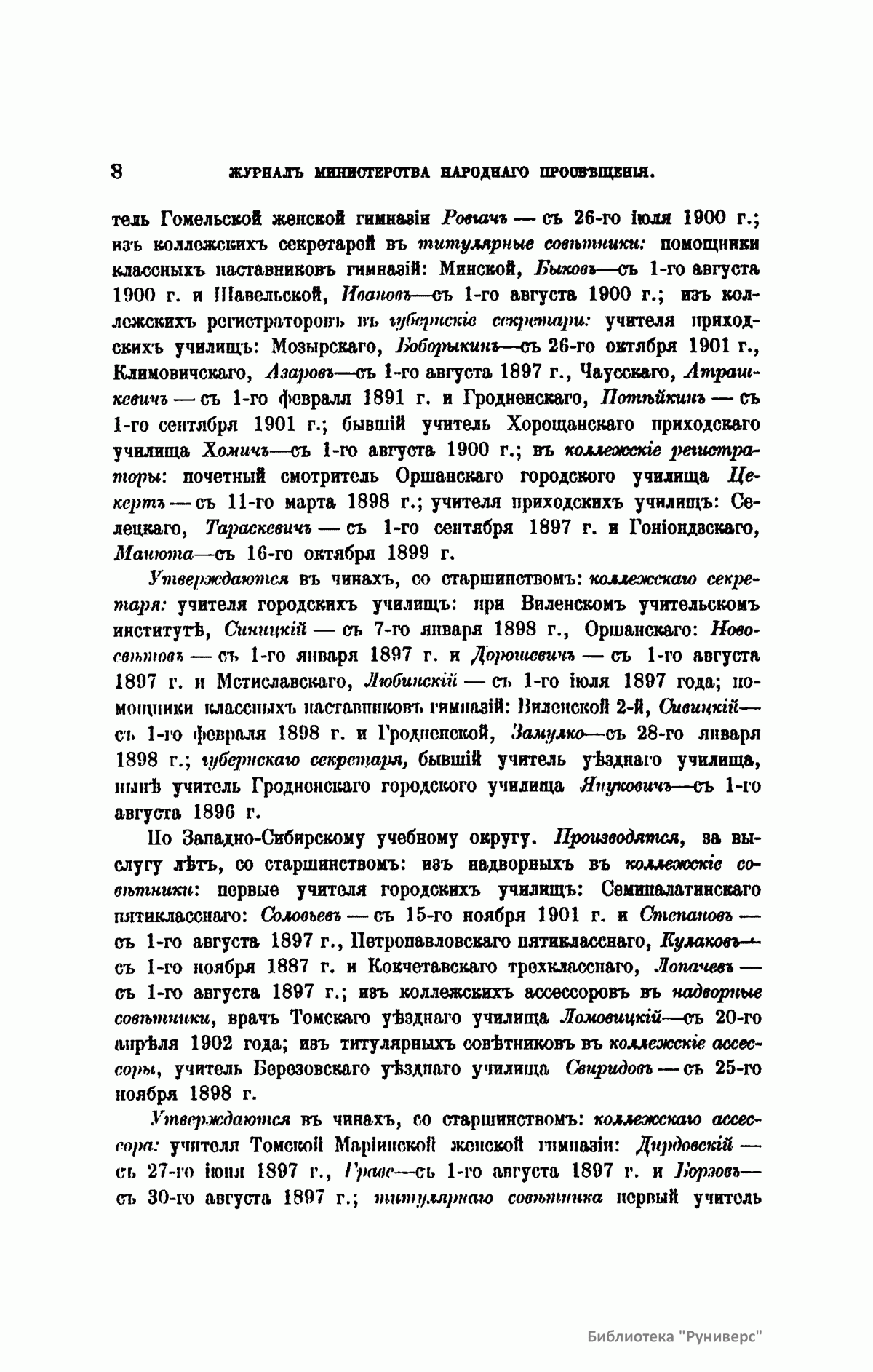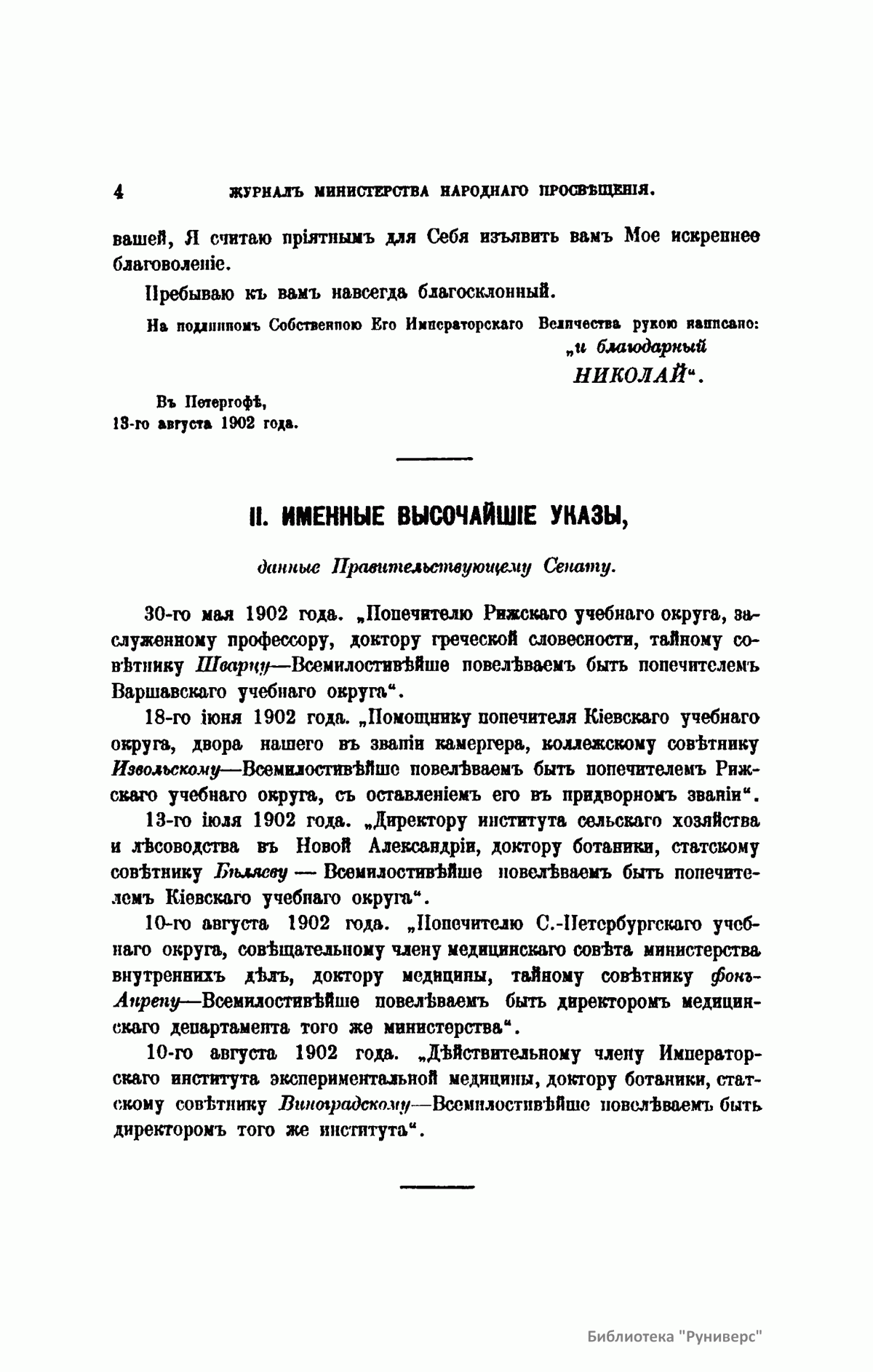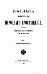 Журнал Министерства народного просвещения выходил с 1834-го по 1917 год. Официальный периодический журнал об успехах просвещения в России. Издатели журнала уверены в том, что «если для каждого человека необходим выход из грубой тьмы невежества и беспрерывное дальнейшее движение к свету, то для народов необходимо попечительное участие правительства в образовании. Только правительство имеет все средства знать и высоту успехов всемирного образования, и настоящие нужды Отечества».