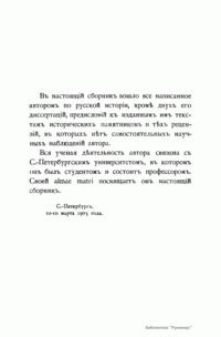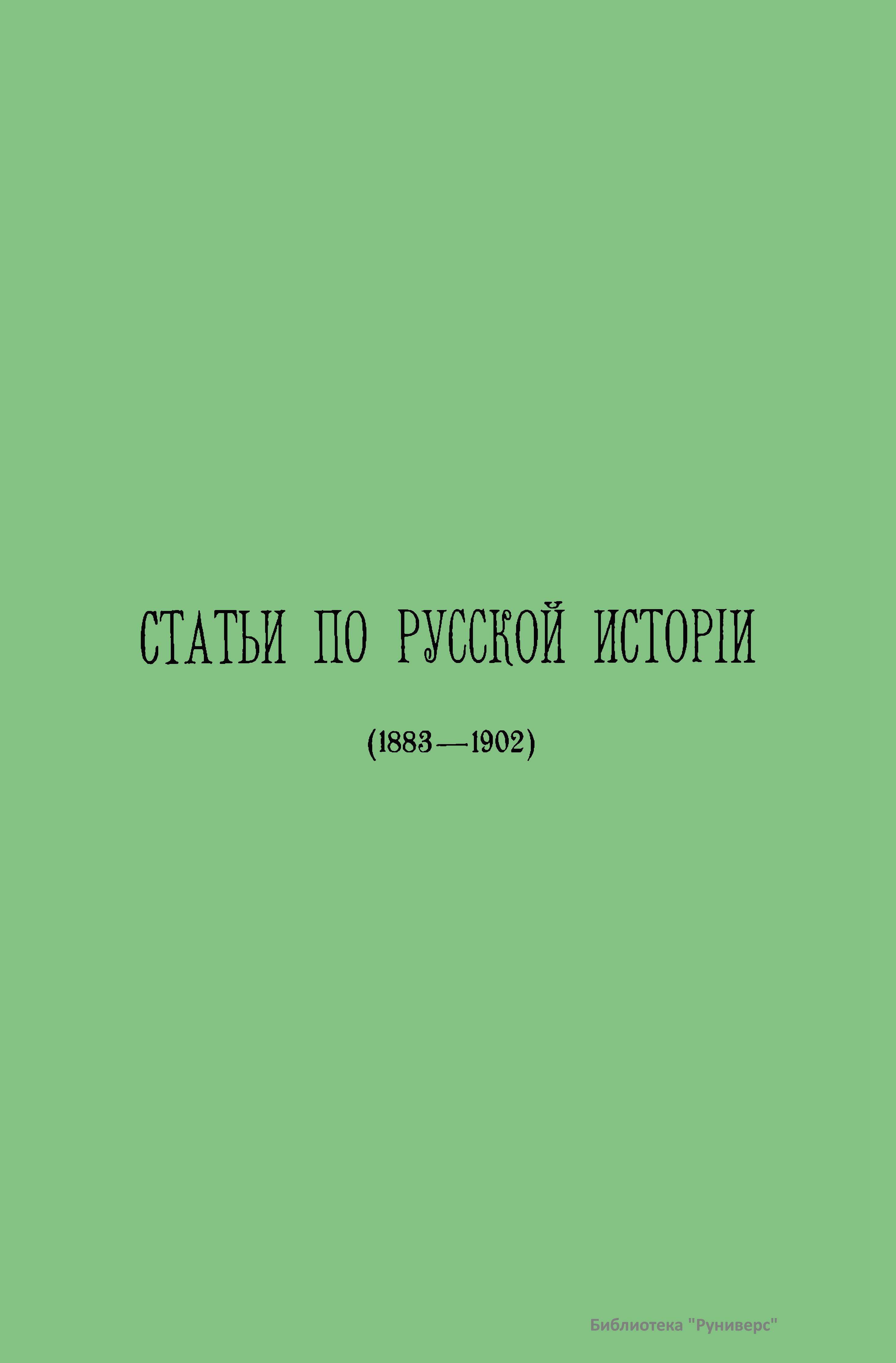 В настоящий сборник вошло все написанное автором по русской истории, кроме двух его диссертаций, предисловий к изданным им текстам исторических памятников и тех рецензий, в которых нет самостоятельных научных наблюдений. Издание посвящено С.-Петербургскому университету, в котором автор был студентом и состоял профессором. Здесь опубликованы следующие статьи: Заметки по истории московских земских соборов. Царь Алексей Михайлович. Новая повесть о Смутном времени XVII века. Московские волнения 1648 года. О начале Москвы. К истории русского города XVI века. «Историографическое» сочинение нашего времени. Нечто о земских «сказках» 1662 года. Как возникли чети. К вопросу о сочинениях кн. И. А. Хворостинина. О двух грамотах 1611 года. Письма Константина Николаевича Бестужева-Рюмина о Смутном времени. О титуле «думный дьяк». Речи Грозного на земском соборе 1550 года. О топографии Угличского кремля в XVI – XVII веках. О происхождении патриарха Гермогена. К вопросу о Никоновском своде. К вопросу о Тайном приказе. Столетие кончины императрицы Екатерины II. Константин Николаевич Бестужев-Рюмин. Василий Григорьевич Василевский.
