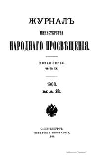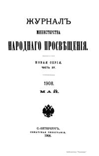 Журнал Министерства народного просвещения выходил с 1834-го по 1917 год. Официальный периодический журнал об успехах просвещения в России. Издатели журнала уверены в том, что «если для каждого человека необходим выход из грубой тьмы невежества и беспрерывное дальнейшее движение к свету, то для народов необходимо попечительное участие правительства в образовании. Только правительство имеет все средства знать и высоту успехов всемирного образования, и настоящие нужды Отечества».