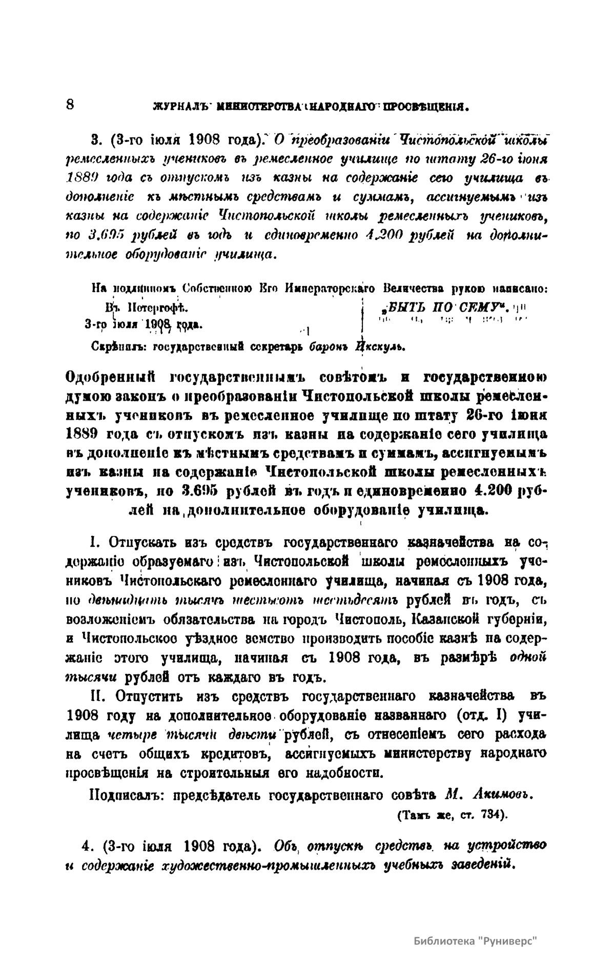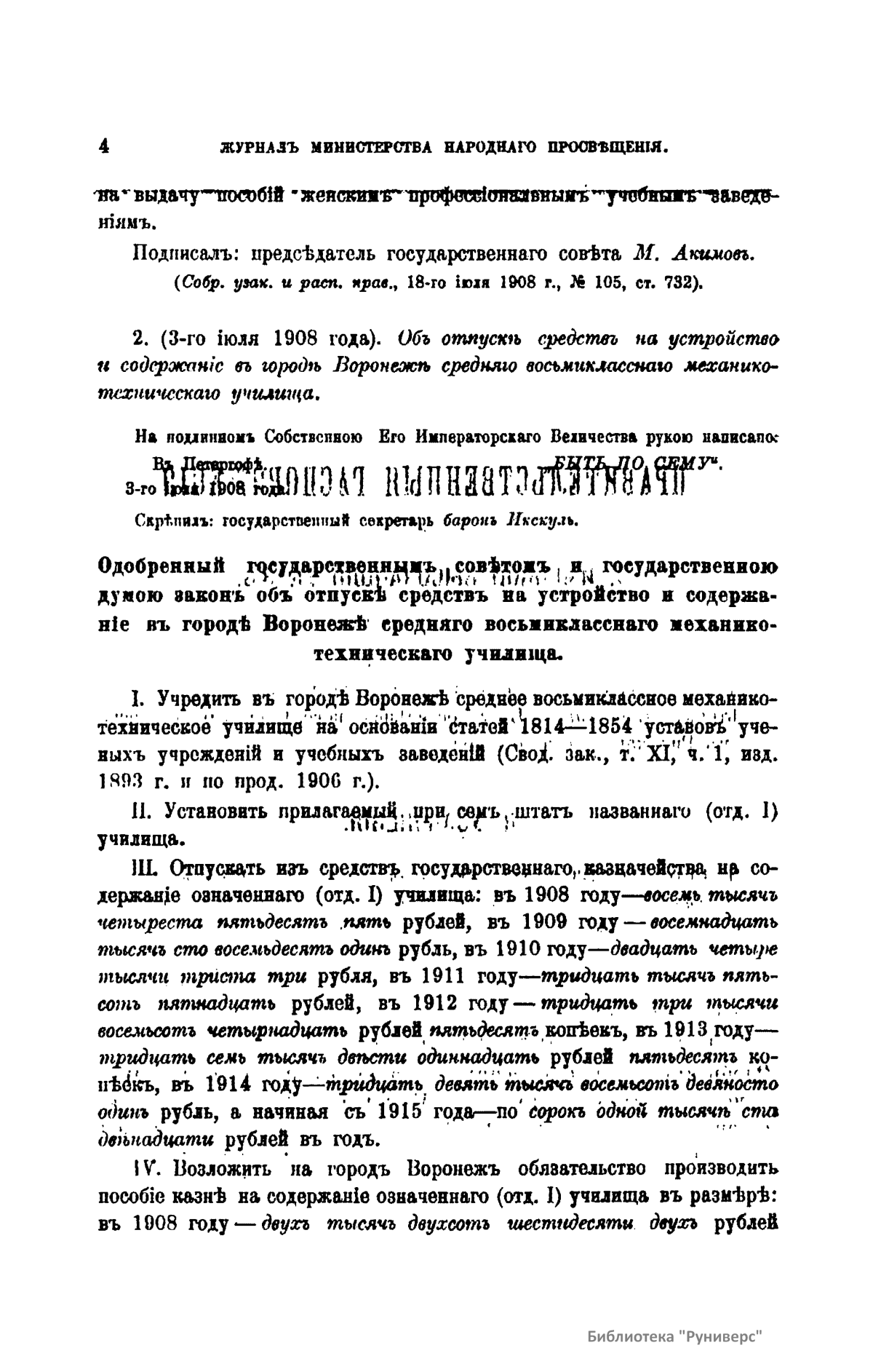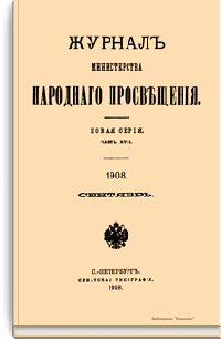 Журнал Министерства народного просвещения выходил с 1834-го по 1917 год. Официальный периодический журнал об успехах просвещения в России. Издатели журнала уверены в том, что «если для каждого человека необходим выход из грубой тьмы невежества и беспрерывное дальнейшее движение к свету, то для народов необходимо попечительное участие правительства в образовании. Только правительство имеет все средства знать и высоту успехов всемирного образования, и настоящие нужды Отечества».