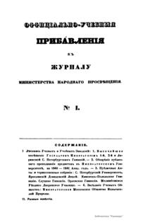 Журнал Министерства народного просвещения выходил с 1834-го по 1917 год. Официальный периодический журнал об успехах просвещения в России. Издатели журнала уверены в том, что «если для каждого человека необходим выход из грубой тьмы невежества и беспрерывное дальнейшее движение к свету, то для народов необходимо попечительное участие правительства в образовании. Только правительство имеет все средства знать и высоту успехов всемирного образования, и настоящие нужды Отечества».