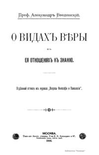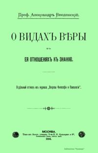 тот опубликовал статью "Вера и знание" (1893, кн.18). Введенский в ответной статье выступил с указанием и характеристикой различных видов веры, рассматриваемой со стороны её отношения к достоверному знанию. Он осуществляет анализ понятия веры и проводит различение между видами в их отношении к деятельности рассудка. Им выделяется наивная, слепая, суетная и сознательная веры. Введенский дает определение веры — это уверенность, исключающая состояние сомнения. Противоположное же вере состояние — это не неверие, а сомнение. Вера, критически рассмотренная и допущенная рассудком, не подвергается протесту с его стороны, так как не противоречит ни логике, ни фактам, тем самым эта вера оказывается неопровержимой, хотя и недоказуемой.