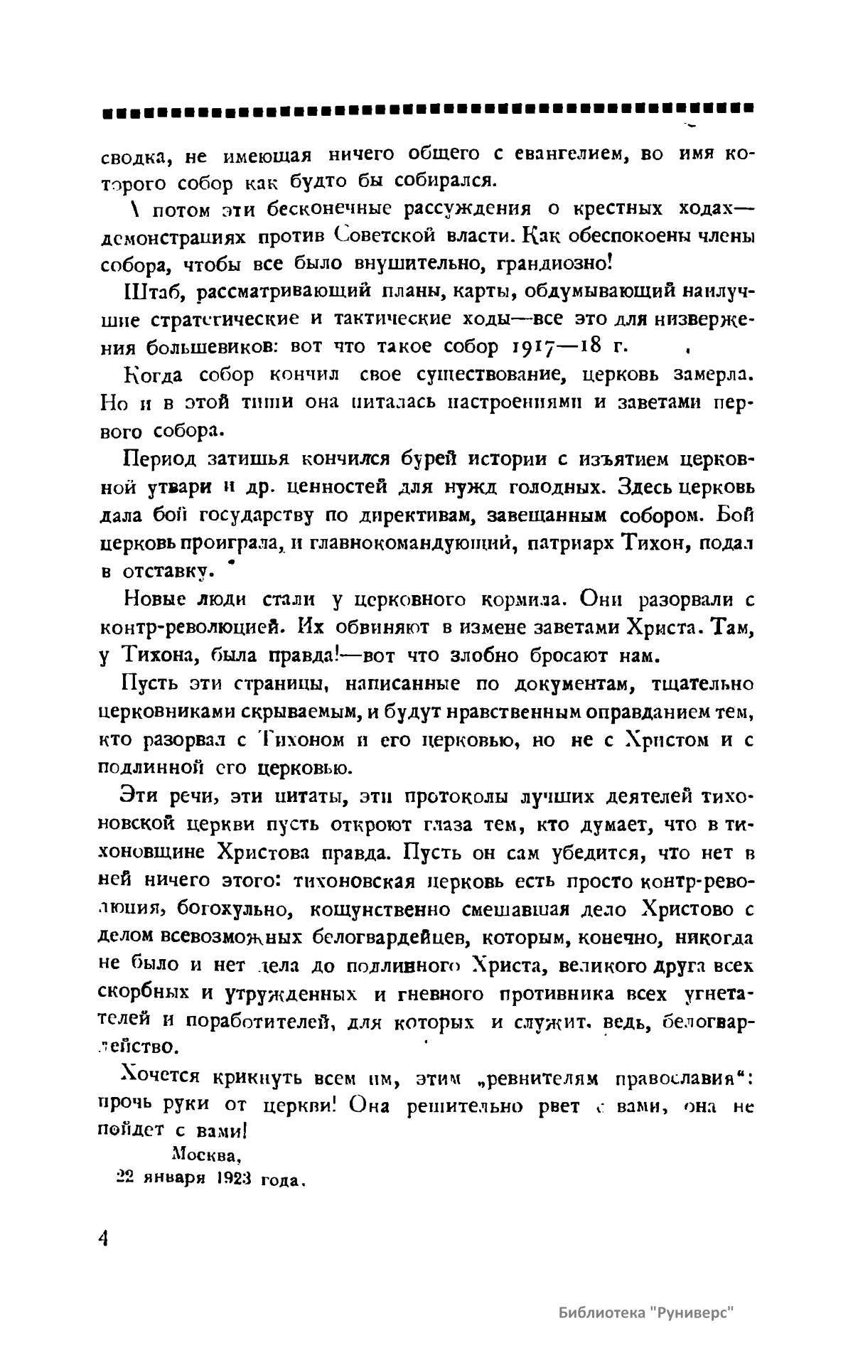 "Церковь и государство" - исторический очерк взаимоотношений церкви и государства в России 1918-1922 годов, где собран обширный материал об отношениях церкви и советского государства в этот период. В предисловии автор формулирует главную задачу своей книги - показать контрреволюционность и воинствующий монархизм Русской Церкви, а в заключение сделан вывод о необходимости церковного переворота. Книга содержит главы, без которых не может обойтись ни один историк церкви.