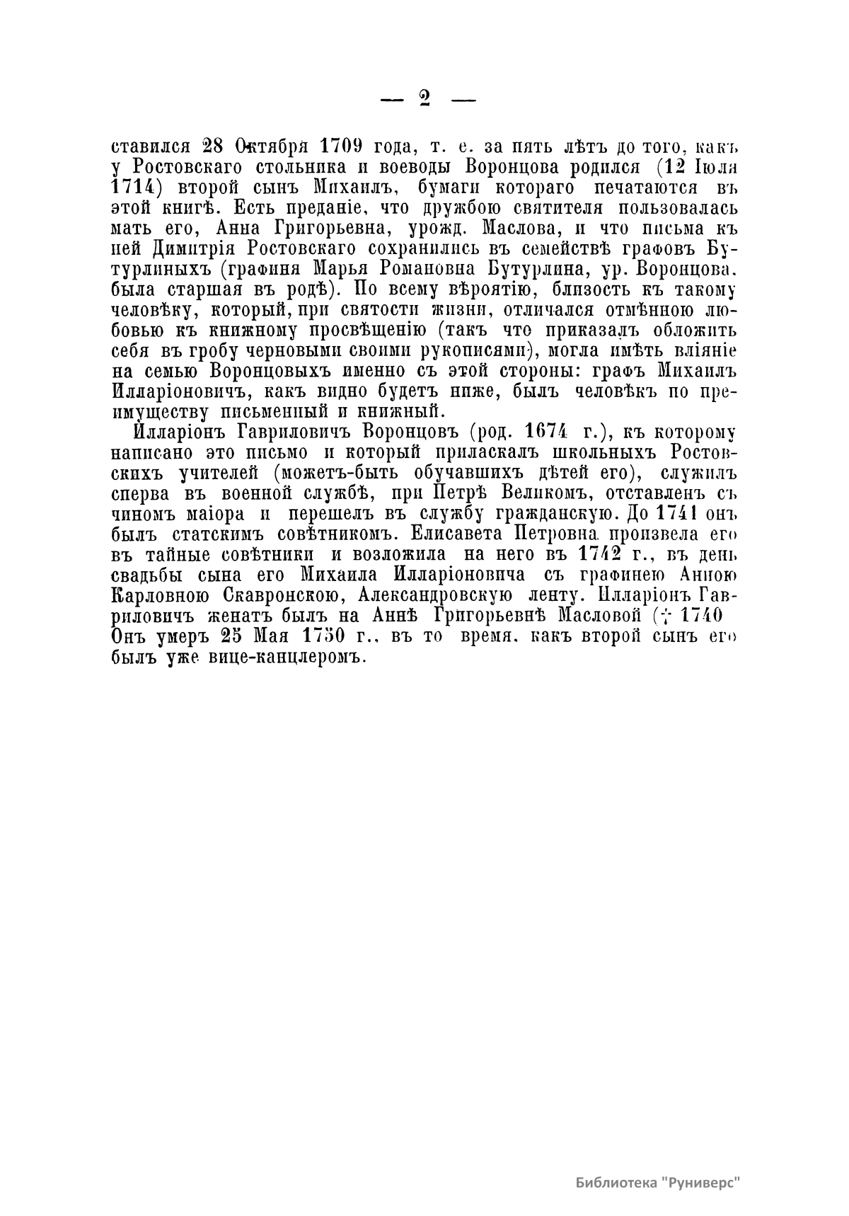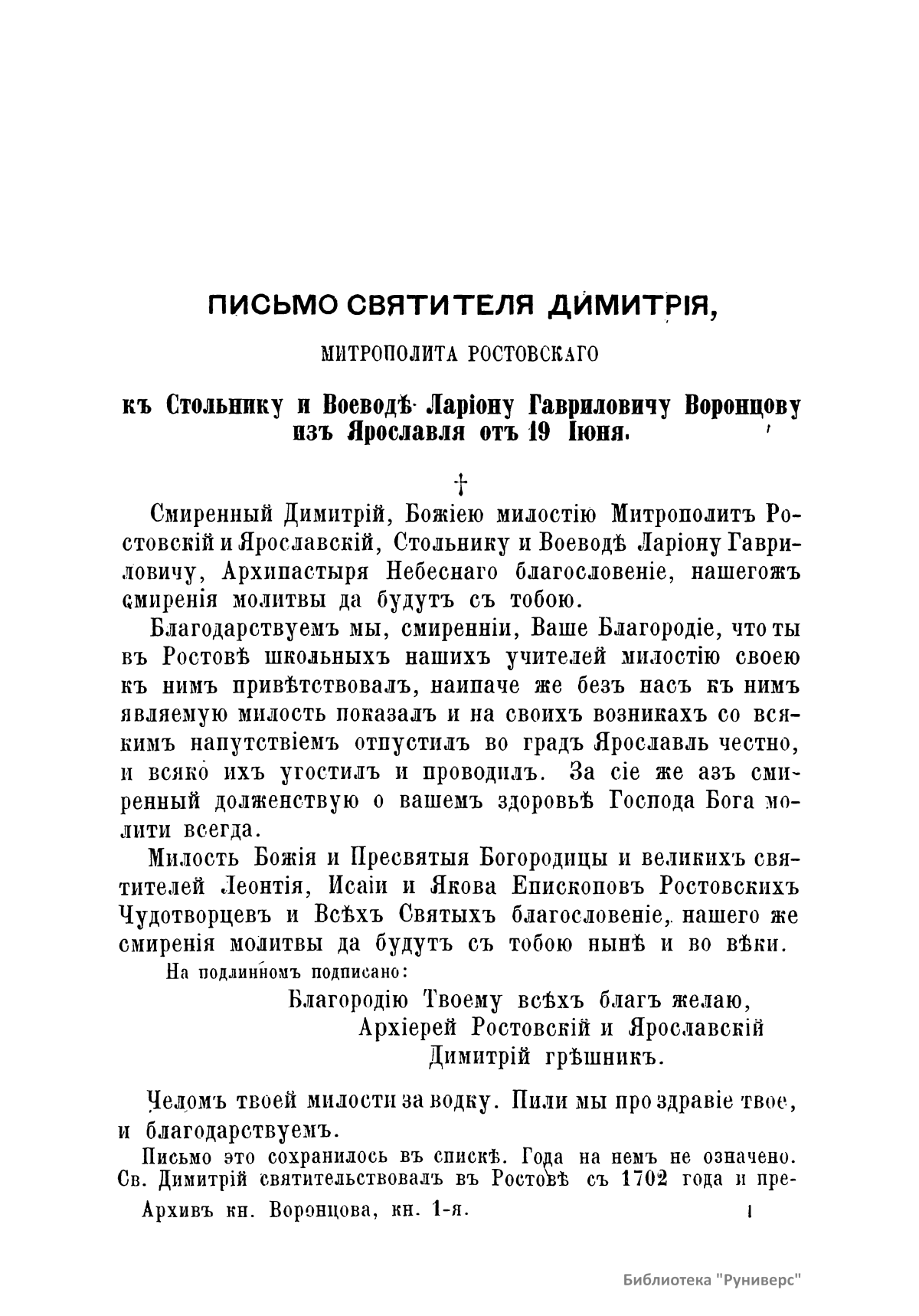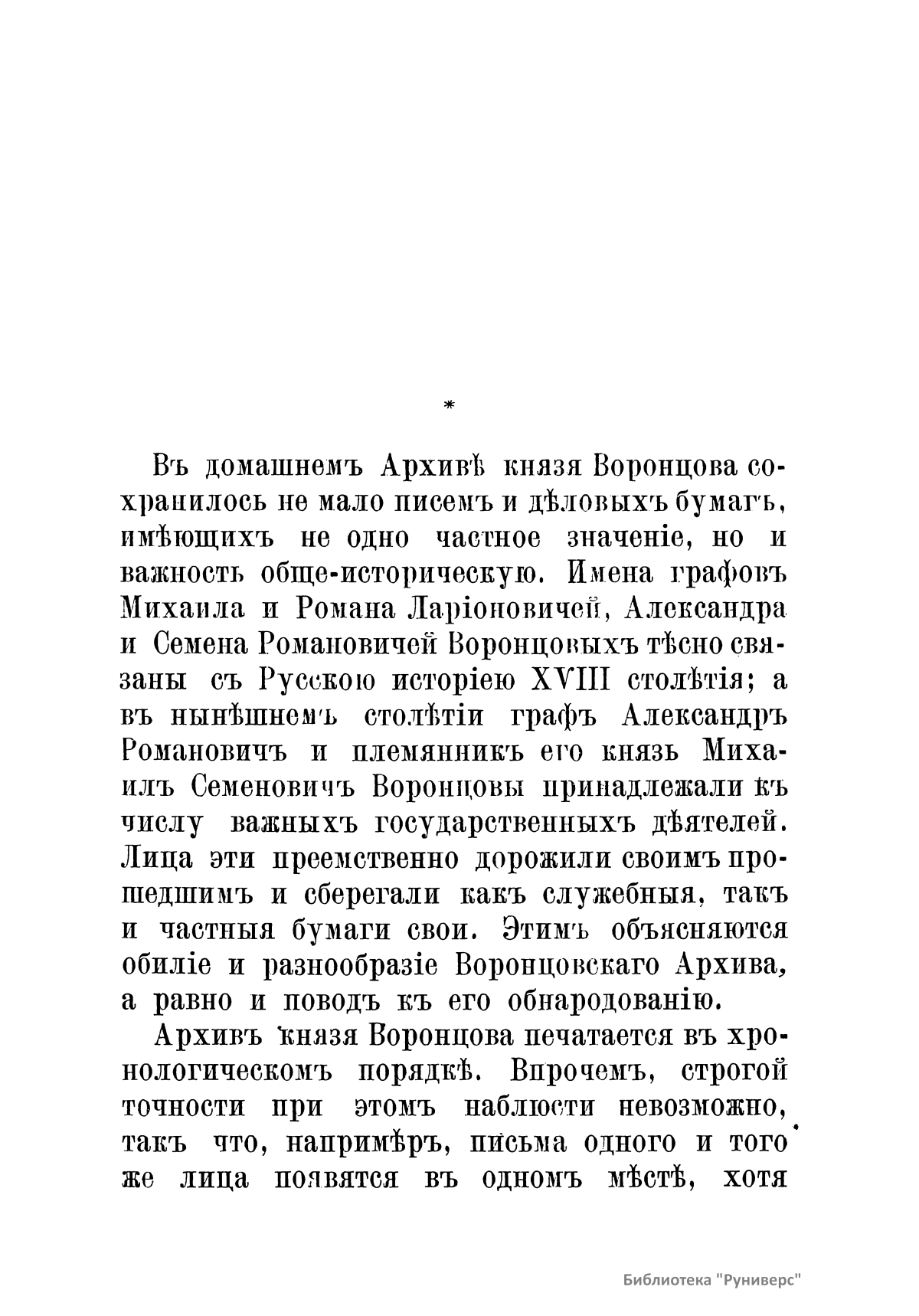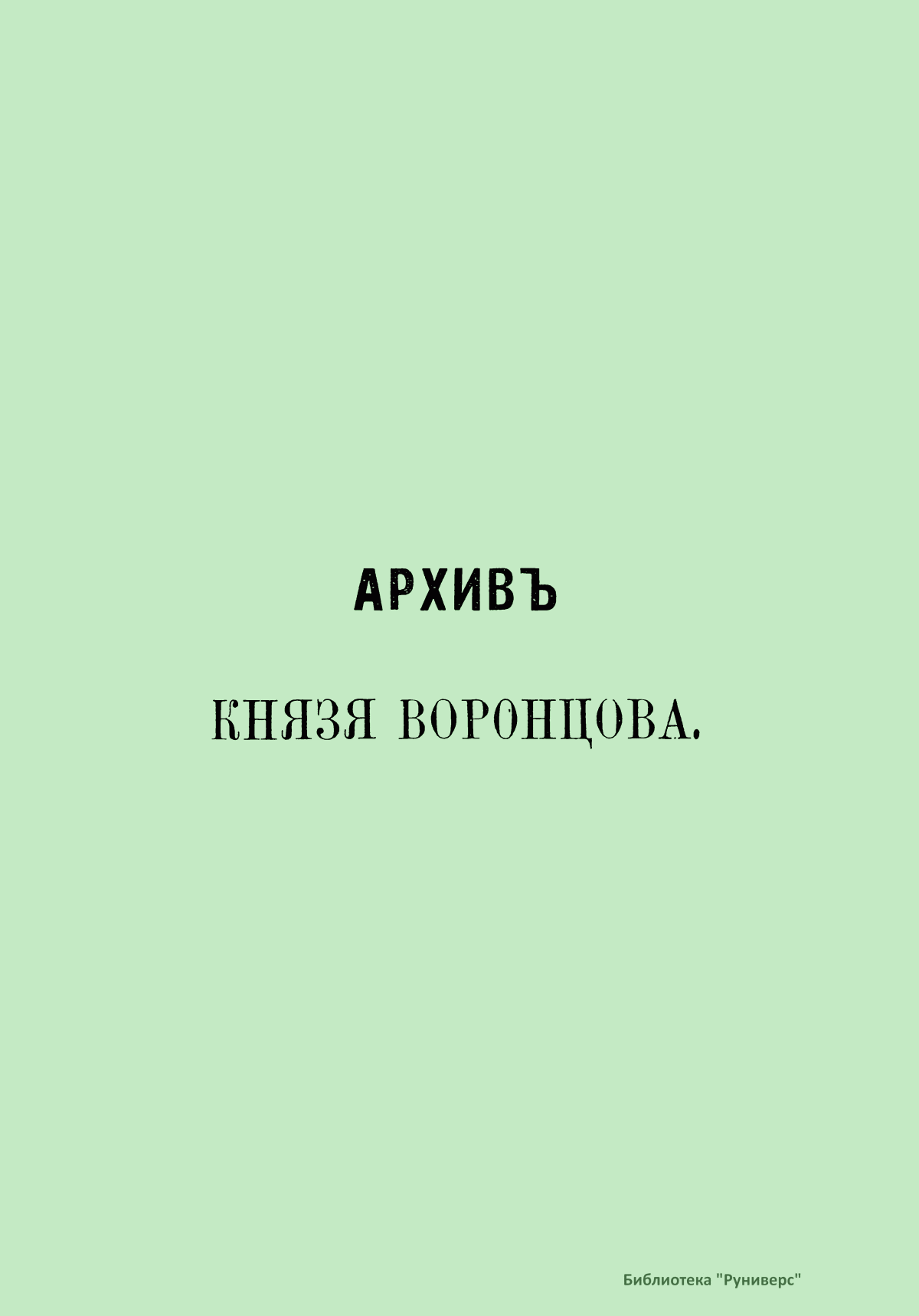 Издание представляет документы из архива графов (с 1845 г. князей) Воронцовых, крупных политических деятелей России XVIII и XIX вв.: Михаила Илларионовича (1714 – 1767) – канцлера при Елизавете Петровне; Романа Илларионовича (1707 – 1783); Александра Романовича (1741 – 1805) – канцлера в 1802 – 1804 гг.; Семена Романовича (1744 – 1832) – посла в Англии в 1785 – 1806 гг.; Михаила Семеновича (1782 – 1856) – фельдмаршала, наместника Кавказа в 1845 – 1853 гг. Архив издан в 40 тт. (1870 – 1895) под редакцией П. И. Бартенева. Содержит огромный материал по внешней политике, по управлению хозяйством Елизаветы Петровны (кн. 1), по делу Миниха и Бирона (кн. 2), о «чумном бунте» 1771 г. в Москве, о движении Е. И. Пугачева (кн. 16), о А. Н. Радищеве (кн. 5, 12, 24). Книга 21-я занята «Записками» Е. Р. Воронцовой (Дашковой). В книге 24-й – свыше 100 писем А. В. Суворова. Среди обширной переписки Воронцовых встречаются письма Вольтера, Д'Аламбера, Жозефа де Местра, Костюшки, Талейрана, Питта и др.