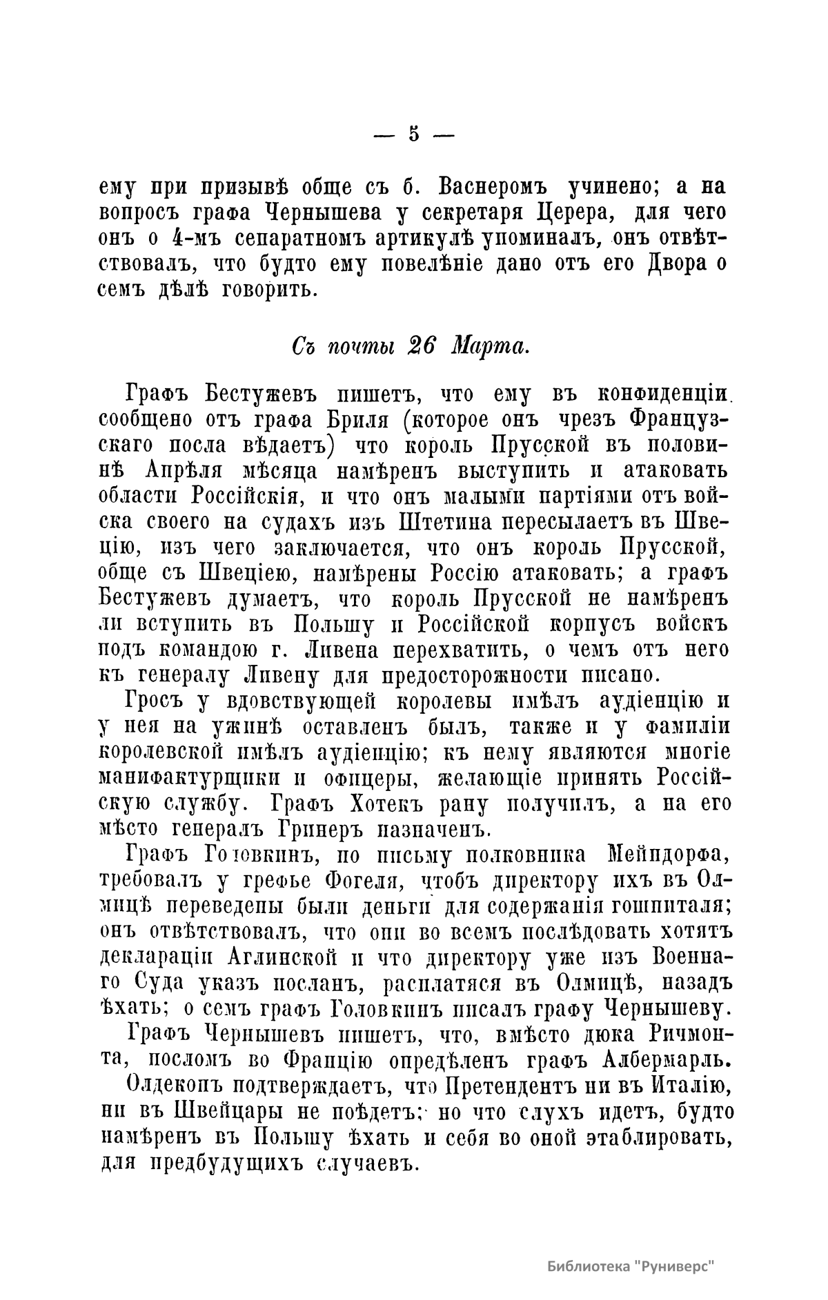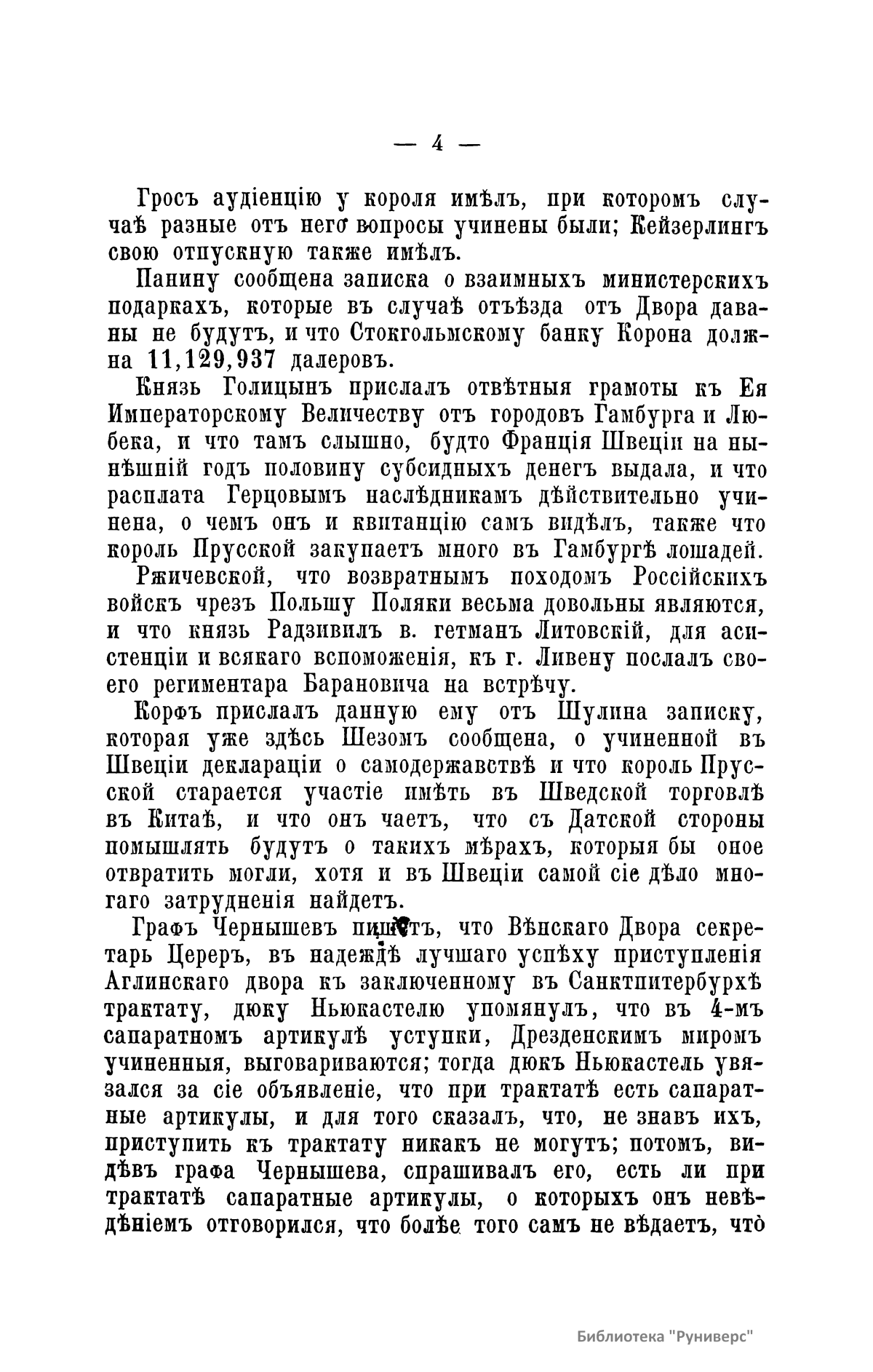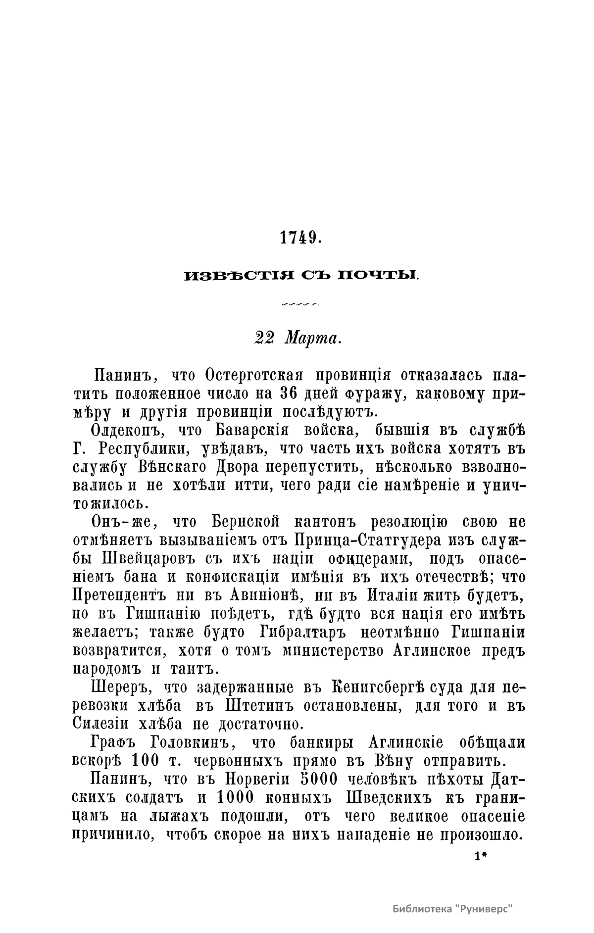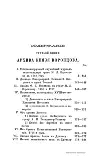 Издание представляет документы из архива графов (с 1845 г. князей) Воронцовых, крупных политических деятелей России XVIII и XIX вв.: Михаила Илларионовича (1714 – 1767) – канцлера при Елизавете Петровне; Романа Илларионовича (1707 – 1783); Александра Романовича (1741 – 1805) – канцлера в 1802 – 1804 гг.; Семена Романовича (1744 – 1832) – посла в Англии в 1785 – 1806 гг.; Михаила Семеновича (1782 – 1856) – фельдмаршала, наместника Кавказа в 1845 – 1853 гг. Архив издан в 40 тт. (1870 – 1895) под редакцией П. И. Бартенева. Содержит огромный материал по внешней политике, по управлению хозяйством Елизаветы Петровны (кн. 1), по делу Миниха и Бирона (кн. 2), о «чумном бунте» 1771 г. в Москве, о движении Е. И. Пугачева (кн. 16), о А. Н. Радищеве (кн. 5, 12, 24). Книга 21-я занята «Записками» Е. Р. Воронцовой (Дашковой). В книге 24-й – свыше 100 писем А. В. Суворова. Среди обширной переписки Воронцовых встречаются письма Вольтера, Д'Аламбера, Жозефа де Местра, Костюшки, Талейрана, Питта и др.