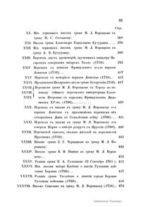 Издание представляет документы из архива графов (с 1845 г. князей) Воронцовых, крупных политических деятелей России XVIII и XIX вв.: Михаила Илларионовича (1714 – 1767) – канцлера при Елизавете Петровне; Романа Илларионовича (1707 – 1783); Александра Романовича (1741 – 1805) – канцлера в 1802 – 1804 гг.; Семена Романовича (1744 – 1832) – посла в Англии в 1785 – 1806 гг.; Михаила Семеновича (1782 – 1856) – фельдмаршала, наместника Кавказа в 1845 – 1853 гг. Архив издан в 40 тт. (1870 – 1895) под редакцией П. И. Бартенева. Содержит огромный материал по внешней политике, по управлению хозяйством Елизаветы Петровны (кн. 1), по делу Миниха и Бирона (кн. 2), о «чумном бунте» 1771 г. в Москве, о движении Е. И. Пугачева (кн. 16), о А. Н. Радищеве (кн. 5, 12, 24). Книга 21-я занята «Записками» Е. Р. Воронцовой (Дашковой). В книге 24-й – свыше 100 писем А. В. Суворова. Среди обширной переписки Воронцовых встречаются письма Вольтера, Д'Аламбера, Жозефа де Местра, Костюшки, Талейрана, Питта и др.