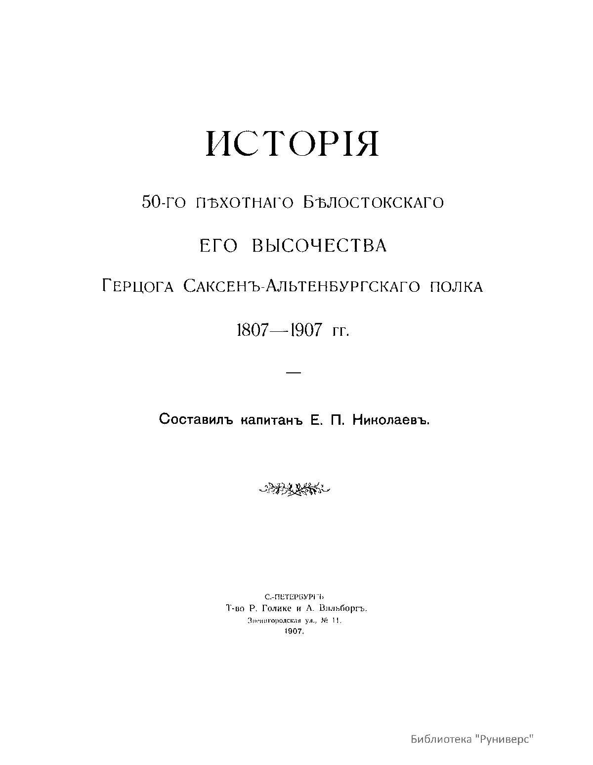Исторiя 50-го пѣхотнаго Бѣлостокскаго Его Высочества Герцога Саксенъ-Альтенбургскаго полка 1807-1907 гг.