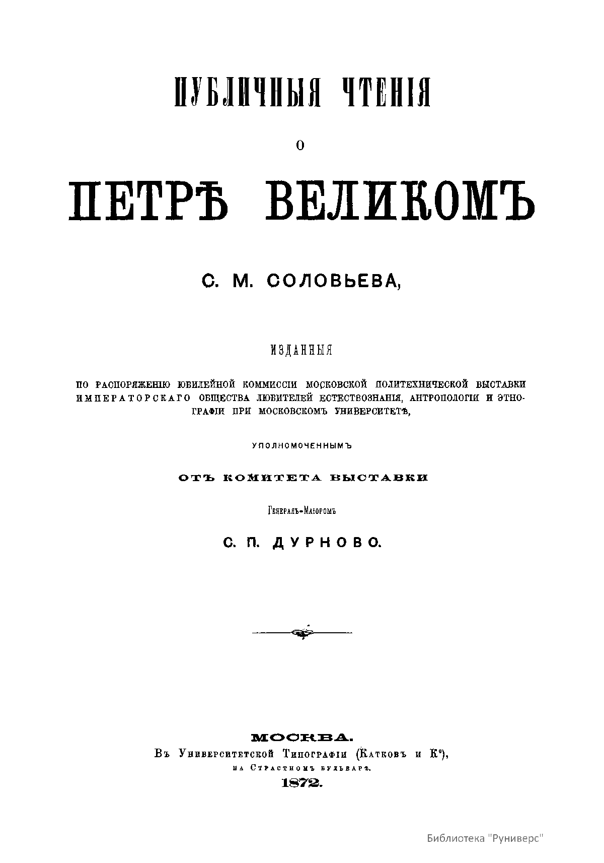 Публичныя чтенiя о Петрѣ Великомъ С.М. Соловьева