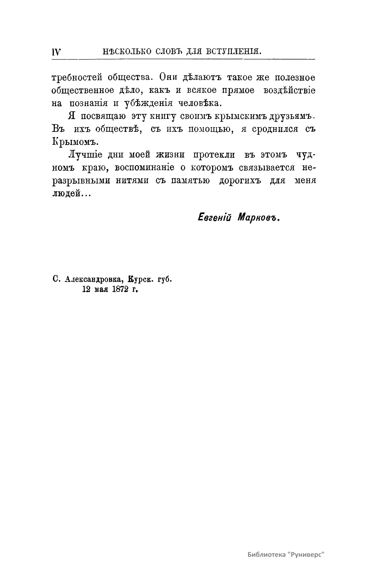 Автор описывает свои впечатления от встречи с новым миром, открывшимся для него в Крыму в 1866 г. Издание представляет собой собрание очерков. Крымские степи, крымское море, крымские горы, легенды и развалины древности, легенды и развалины истории нового времени, Бахчисарай и Севастополь, южный берег и пещерные города – все типичное Крыма нашло свое место на страницах этих очерков. Автор не стесняет себя последовательностью и внешней полнотой описания, он набрасывает в свой путевой альбом все, что поражало его, и признается в том, что лучшие дни его жизни протекли в этом чудесном краю. «Очерки» опубликованы в 1883 г., когда исполнилось сто лет со дня присоединения Крыма к России. Воспоминание об этом важном событии русской государственной истории должно, по мнению автора, побудить русского читателя ознакомиться как можно ближе с прошлым и настоящим этого очаровательного края, который вошел сто лет назад в состав русского царства как его лучшая жемчужина, по счастливому выражению великой императрицы.