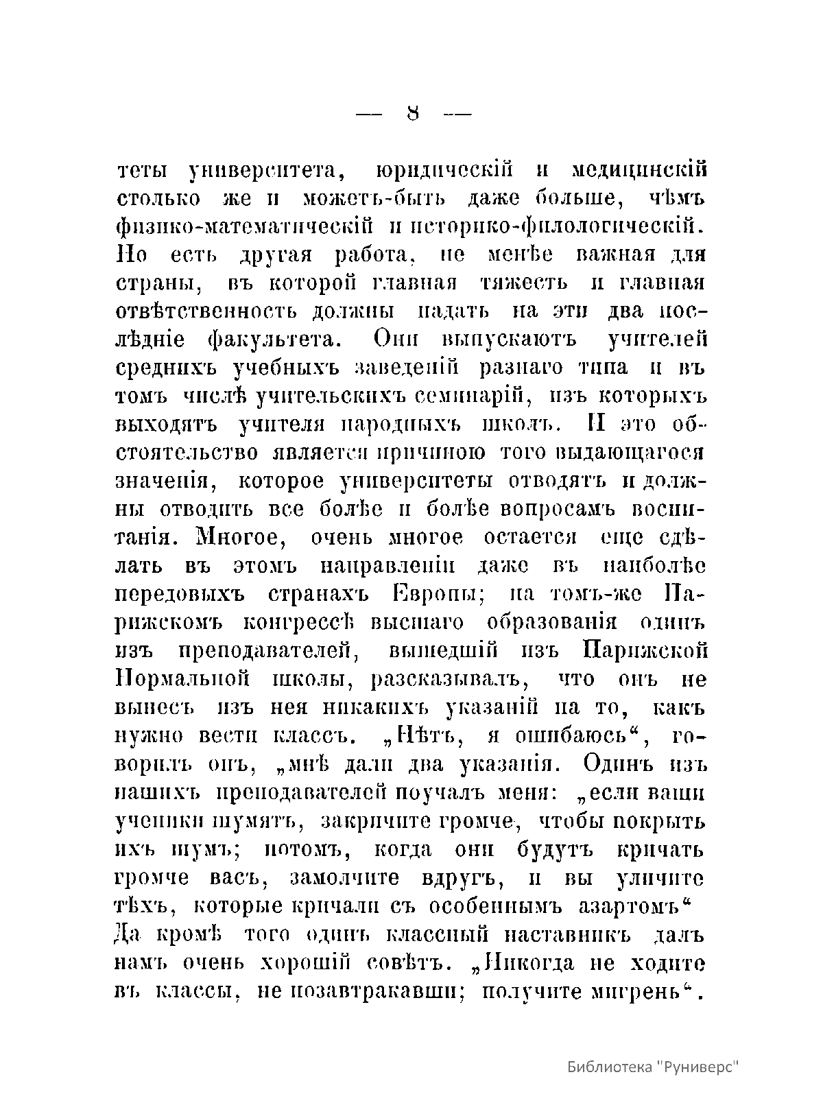 В речи подчеркивается необходимость восстановления влияния университетов на дело национального воспитания, поскольку его факультеты выпускают учителей для средних учебных заведений, указывается важность изучения педагогики, особенности ее преподавания, обосновывается необходимость организации специальной кафедры при университетах.