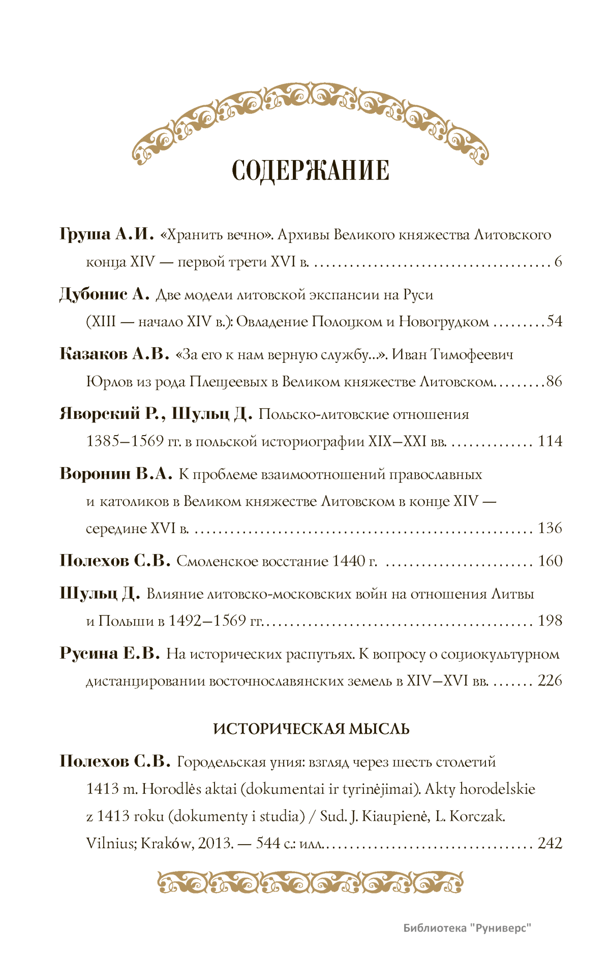 XIII–XVI столетия принципиально изменили карту Восточной Европы. Появление на ее просторах улуса Монгольской империи — Золотой Орды запустило процесс выдвижения новых политических центров. Одним из них стала Москва, но рядом с ней выросла другая Русь — Великое княжество Литовское и Русское, большая часть населения которого называлась «русскими» или «русинами» — но не считала себя «московитами». В средневековой Европе Литва сочетала воинственную центральную власть князей Гедиминовичей с широкими автономными правами отдельных земель и получила уникальный опыт конфессиональной и национальной терпимости. В номере собраны работы исследователей, с разных сторон изучав-ших своеобразие литовской модели государственности и факторы, способствовавшие дивергенции систем общественно-политического устройства двух крупнейших государств Восточной Европы — Великого княжества Литовского и Московского царства. Редакция «Исторического вестника» предоставила возможность высказать свои позиции не только российским историкам, но и их коллегам с Украины, Белоруссии, Литвы и Польши — тех стран, которые считают себя преемниками средневековой державы Гедиминовичей. А. Дубонис (Литва) показал, как грабительские походы литовских дружин превратились в завоевание соседних земель, и выделил две различные модели литовской экспансии — военную и мирную. Статья С.В. Полехова (Россия) посвящена восстанию в Смоленске в 1440 г. в контексте в целом успешного процесса интеграции Смоленщины: к началу XVI в. смоленские бояре, мещане и даже «черные люди» прочно ассоциировали себя с Великим княжеством Литовским. Е.В. Русина (Украина) попыталась оценить, как отвечает современная историография на вопрос: почему на руинах Древнерусской державы одновременно возникли столь непохожие друг на друга великие княжества Московское и Литовское, имевшие разную логику исторического развития? Д. Шульц и Р. Яворский (Польша) представили обзор трудов польских историков, посвященных ключевым в польско-литовских отношениях событиям — Кревскому акту 1385 г. и Люблинской унии 1569 г. А.И. Груша (Белоруссия) постарался обобщить сведения и выявить специфику (децентрализацию и подвижность) различных видов архивов Великого княжества Литовского, рассеянных ныне по архивохранилищам нескольких государств. А.В. Казаков (Белоруссия) проследил судьбу московского выходца XVI века И.Т. Юрлова, чей жизненный путь можно считать примером успешной интеграции эмигранта в социум Великого княжества Литовского в условиях благоприятного для москвичей «социокультурного климата» этого государства. В.А. Воронин (Белоруссия) оценил, как развивались отношения между католиками и православными в Великом княжестве в конце XIV — середине XVI в., и показал, что католической элите не удалось добиться абсолютного превосходства. До серьезных конфликтов на религиозной почве дело не доходило — в обществе были выработаны эффективные механизмы разрешения возникавших на конфессиональной почве противоречий. Д. Шульц (Польша) изучил влияние московско-литовских войн на процесс объединения Великого княжества с королевством Польским. Завершает номер рецензия С.В. Полехова на последнее издание документов Городельской унии Литвы и Польши 1413 г., посвящённая оценке реальных мер, направленных на интеграцию восточ
