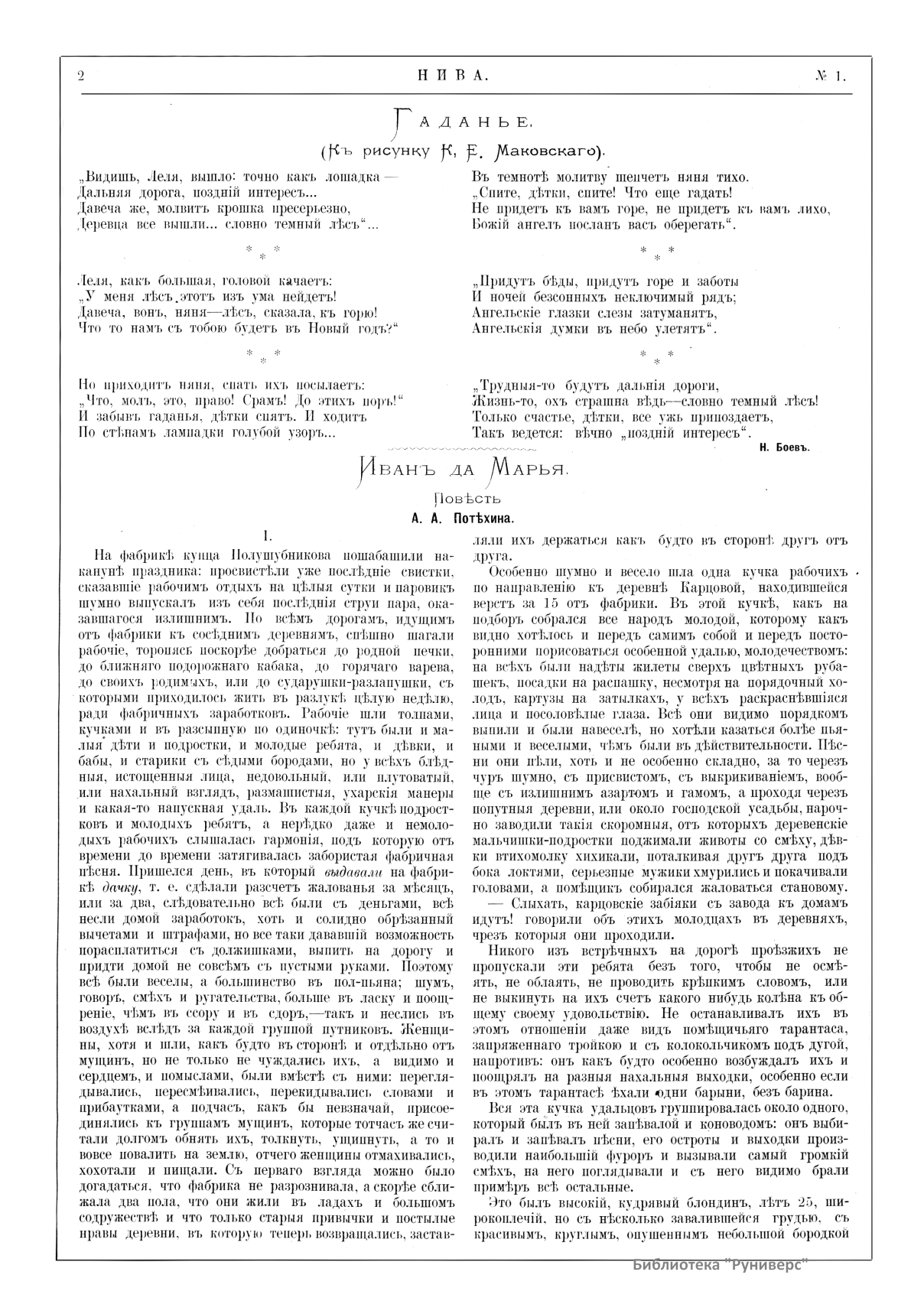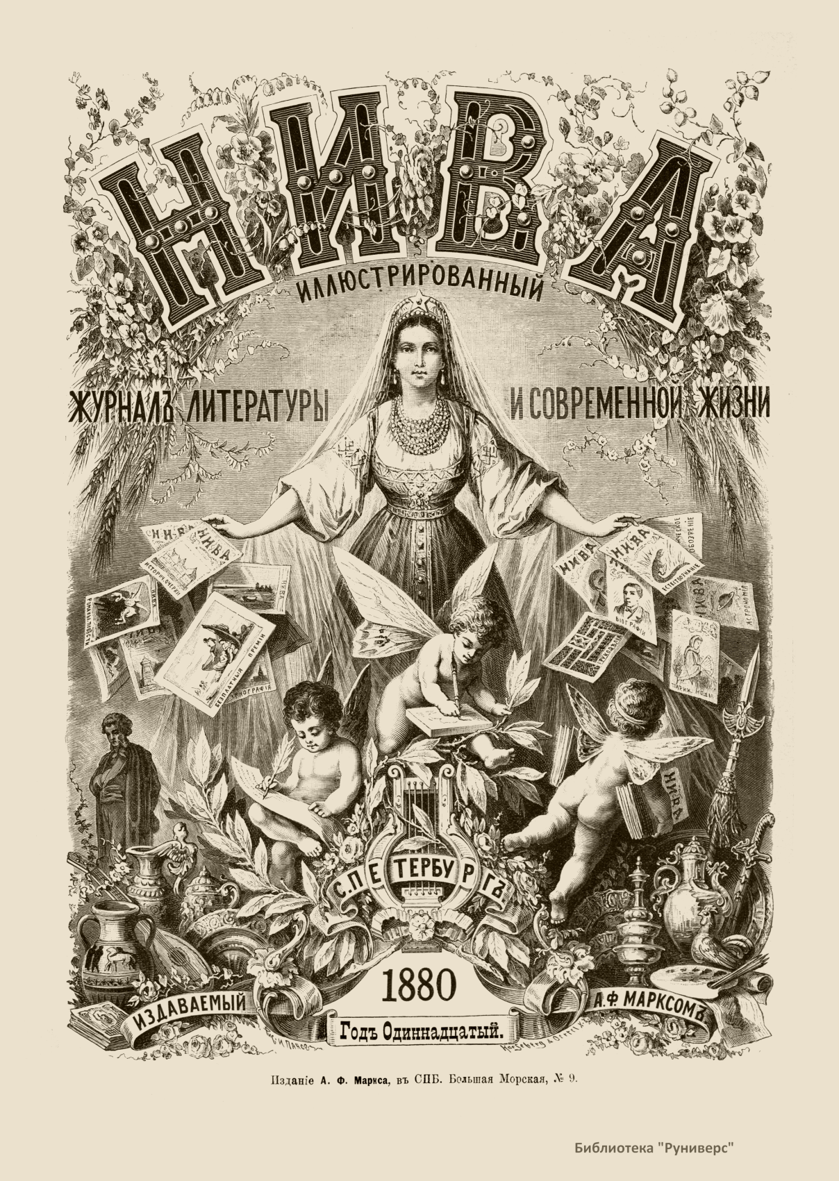 «Нива» — популярный еженедельный русский журнал с приложениями, издававшийся со второй половины XIX до начала XX века, носил подзаголовок «Журнал литературы, политики и современной жизни». Журнал был любимым детищем А. Ф. Маркса, возглавлявшего свое издательство вплоть до своей смерти в 1904 г. Позиционировалась «Нива» как иллюстрированный журнал для семейного чтения и был ориентирован, главным образом, на обывателя. В журнале публиковались литературные произведения, исторические, научно-популярные очерки, репродукции и гравюры картин современных художников. Материалы политического и общественного содержания также сопровождались многочисленными иллюстрациями. Среди известных литераторов, печатавшихся в журнале, были А. К. Толстой, Ф. И. Тютчев, Л. Н. Толстой, А. А. Фет, А. П. Чехов, Максим Горький, Корней Чуковский, Анна Ахматова, Иван Бунин и многие другие. Благодаря «Ниве» сочинения многих современных авторов добрались до самых отдаленных областей России.