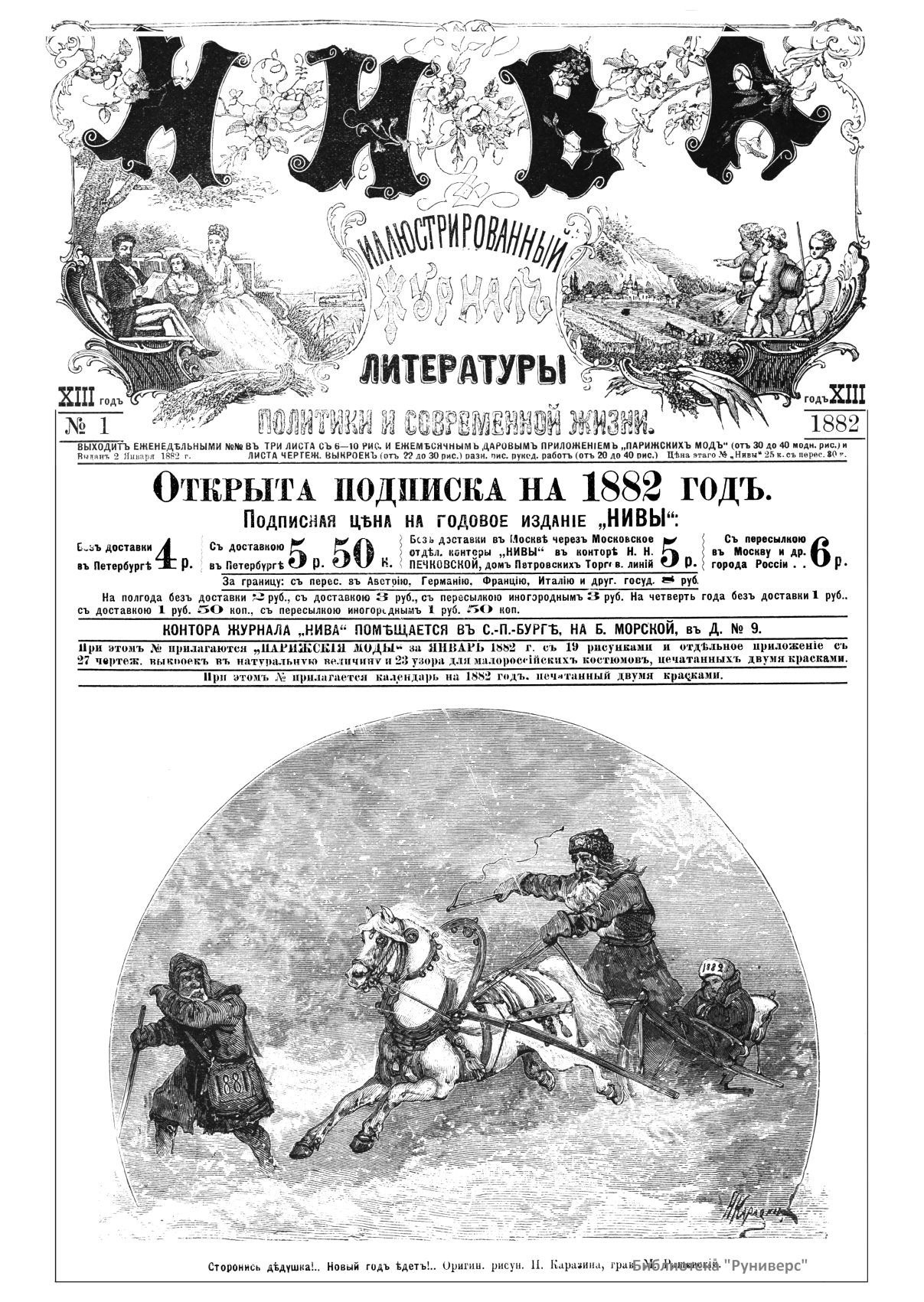 «Нива» — популярный еженедельный русский журнал с приложениями, издававшийся со второй половины XIX до начала XX века, носил подзаголовок «Журнал литературы, политики и современной жизни». Журнал был любимым детищем А. Ф. Маркса, возглавлявшего свое издательство вплоть до своей смерти в 1904 г. Позиционировалась «Нива» как иллюстрированный журнал для семейного чтения и был ориентирован, главным образом, на обывателя. В журнале публиковались литературные произведения, исторические, научно-популярные очерки, репродукции и гравюры картин современных художников. Материалы политического и общественного содержания также сопровождались многочисленными иллюстрациями. Среди известных литераторов, печатавшихся в журнале, были А. К. Толстой, Ф. И. Тютчев, Л. Н. Толстой, А. А. Фет, А. П. Чехов, Максим Горький, Корней Чуковский, Анна Ахматова, Иван Бунин и многие другие. Благодаря «Ниве» сочинения многих современных авторов добрались до самых отдаленных областей России.