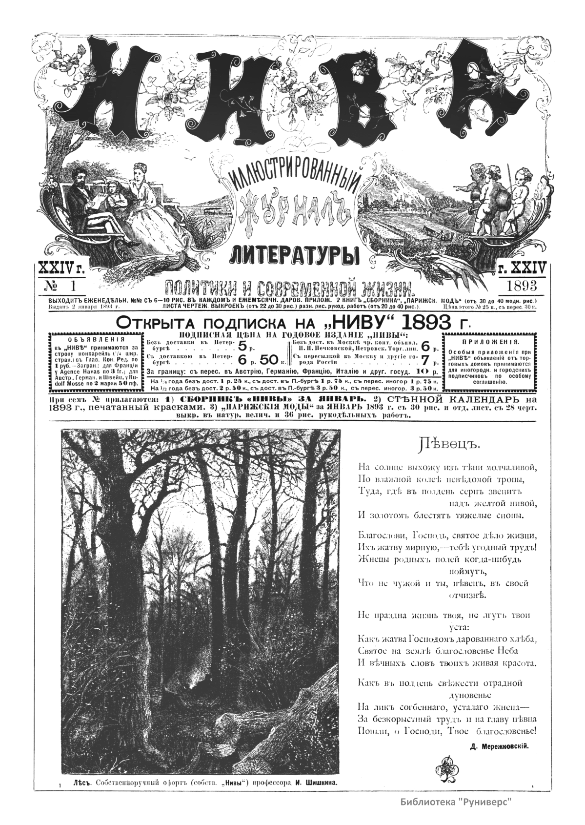 «Нива» — популярный еженедельный русский журнал с приложениями, издававшийся со второй половины XIX до начала XX века, носил подзаголовок «Журнал литературы, политики и современной жизни». Журнал был любимым детищем А. Ф. Маркса, возглавлявшего свое издательство вплоть до своей смерти в 1904 г. Позиционировалась «Нива» как иллюстрированный журнал для семейного чтения и был ориентирован, главным образом, на обывателя. В журнале публиковались литературные произведения, исторические, научно-популярные очерки, репродукции и гравюры картин современных художников. Материалы политического и общественного содержания также сопровождались многочисленными иллюстрациями. Среди известных литераторов, печатавшихся в журнале, были А. К. Толстой, Ф. И. Тютчев, Л. Н. Толстой, А. А. Фет, А. П. Чехов, Максим Горький, Корней Чуковский, Анна Ахматова, Иван Бунин и многие другие. Благодаря «Ниве» сочинения многих современных авторов добрались до самых отдаленных областей России.