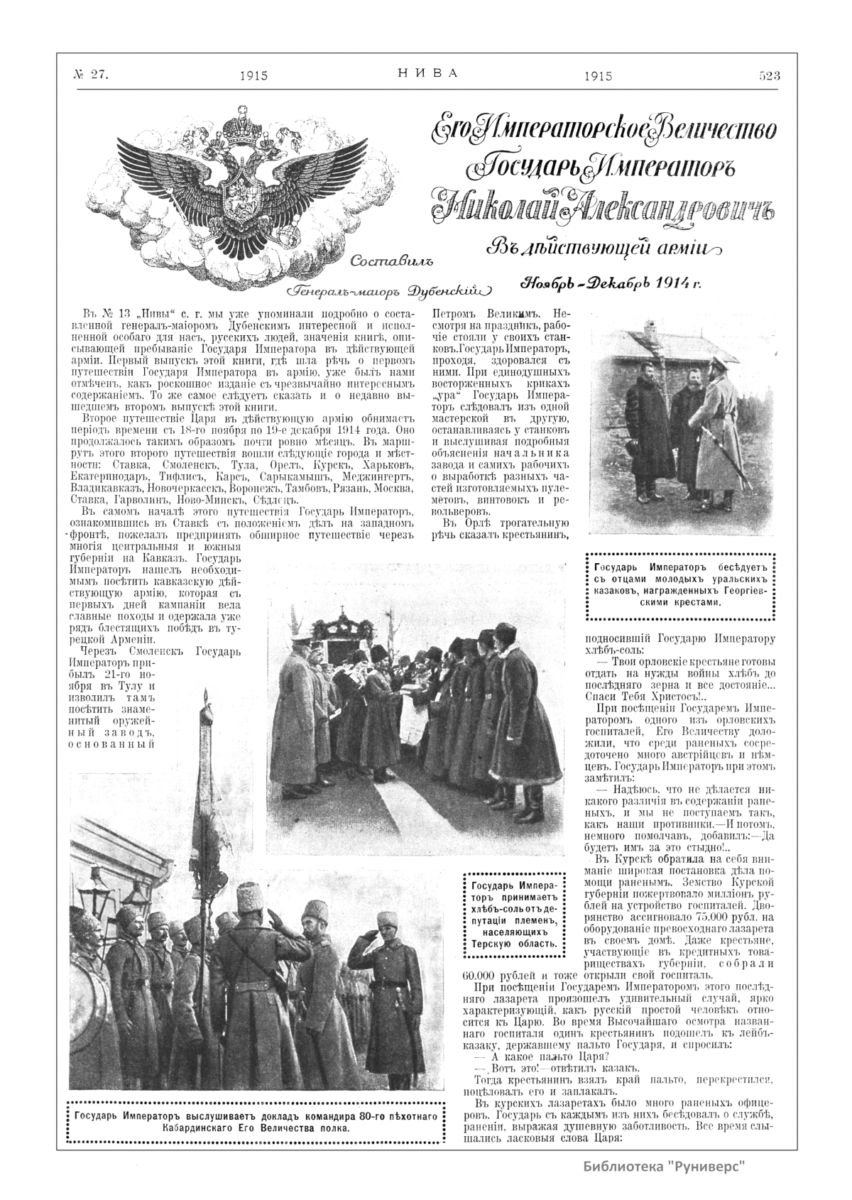 «Нива» — популярный еженедельный русский журнал с приложениями, издававшийся со второй половины XIX до начала XX века, носил подзаголовок «Журнал литературы, политики и современной жизни». Журнал был любимым детищем А. Ф. Маркса, возглавлявшего свое издательство вплоть до своей смерти в 1904 г. Позиционировалась «Нива» как иллюстрированный журнал для семейного чтения и был ориентирован, главным образом, на обывателя. В журнале публиковались литературные произведения, исторические, научно-популярные очерки, репродукции и гравюры картин современных художников. Материалы политического и общественного содержания также сопровождались многочисленными иллюстрациями. Среди известных литераторов, печатавшихся в журнале, были А. К. Толстой, Ф. И. Тютчев, Л. Н. Толстой, А. А. Фет, А. П. Чехов, Максим Горький, Корней Чуковский, Анна Ахматова, Иван Бунин и многие другие. Благодаря «Ниве» сочинения многих современных авторов добрались до самых отдаленных областей России.