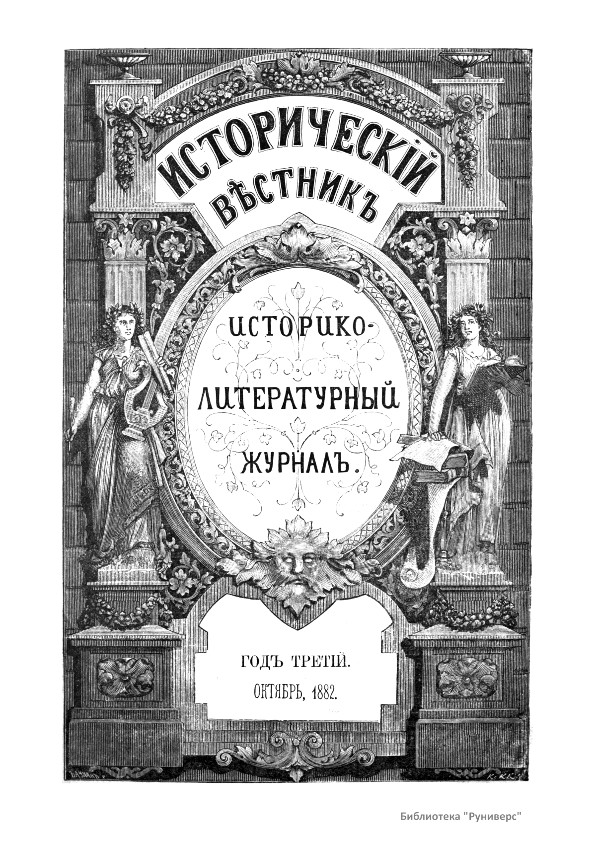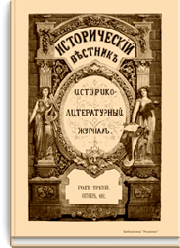 «Исторический вестник» - русский ежемесячный историко-литературный журнал. Издавался в Санкт-Петербурге с 1880-го по 1917 г. Журнал был основан А.С. Сувориным и С.Н. Шубинским с целью «знакомить читателей в живой, общедоступной форме с современным состоянием исторической науки и литературы в России и Европе». Вышло 150 тт. Каждый том состоял из трёх ежемесячных выпусков, имел свою нумерацию страниц, оглавление, список иллюстраций. Журнал приобрёл устойчивую популярность среди читателей, заняв прочное место в «триумвирате» русских исторических журналов наряду с «Русским архивом» и «Русской стариной». опережая их по количеству подписчиков. Отличием «Исторического вестника» было то, что он не помещал на своих страницах необработанных, сырых материалов. С другой стороны, журнал приближался по своему типу к журналам общелитературного образца, сочетая в себе коммерческий успех и доступное изложение материала.