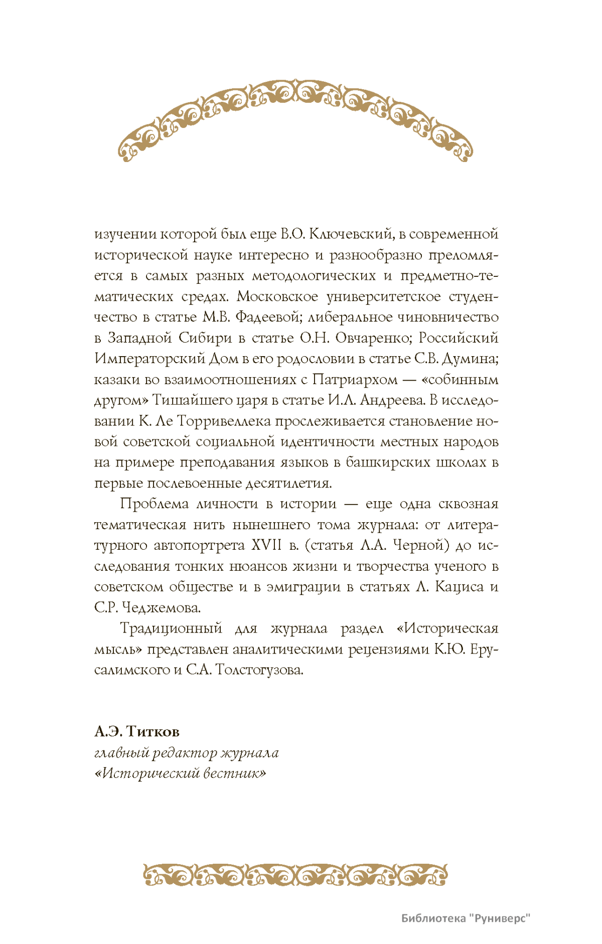 Дорогие коллеги, мы представляем вам первый номер «Исторического вестника», который одновременно обозначается 148-м томом, тем самым продолжая дореволюционное издание. Однако, перешагивая почти сто лет, мы понимаем, что реалии XXI века определяют и новое содержание журнала. История сегодня во многом актуализирована политикой. Именно геополитическая ситуация в мире, возвращающая нас к вопросам сохранения существующих границ, национальных и культурных ценностей, моральных и религиозных принципов, формирует еще одно измерение — проблему аутентичного исторического бытования народов и государств. С одной стороны, это вопрос географических ареалов государственных образований, с другой — тема, связанная с соприкосновением, взаимодействием процессов, культур и традиций. Во многом мы стоим и перед важнейшей этической проблемой. Мы должны не только вежливо и настойчиво указывать нашим уважаемым соседям на свои исторические права, но и сами уходить от искушения искусственного удревнения собственной истории или присвоения чужой. И здесь на сцену выходит его величество Исторический Научный Факт. Он и есть главный цензор и законодатель. На этом незыблемом основании будет строиться редакционная и научная работа «Исторического вестника».