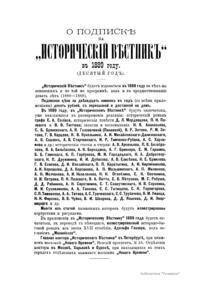«Исторический вестник» - русский ежемесячный историко-литературный журнал. Издавался в Санкт-Петербурге с 1880-го по 1917 г. Журнал был основан А.С. Сувориным и С.Н. Шубинским с целью «знакомить читателей в живой, общедоступной форме с современным состоянием исторической науки и литературы в России и Европе». Вышло 150 тт. Каждый том состоял из трёх ежемесячных выпусков, имел свою нумерацию страниц, оглавление, список иллюстраций. Журнал приобрёл устойчивую популярность среди читателей, заняв прочное место в «триумвирате» русских исторических журналов наряду с «Русским архивом» и «Русской стариной». опережая их по количеству подписчиков. Отличием «Исторического вестника» было то, что он не помещал на своих страницах необработанных, сырых материалов. С другой стороны, журнал приближался по своему типу к журналам общелитературного образца, сочетая в себе коммерческий успех и доступное изложение материала.