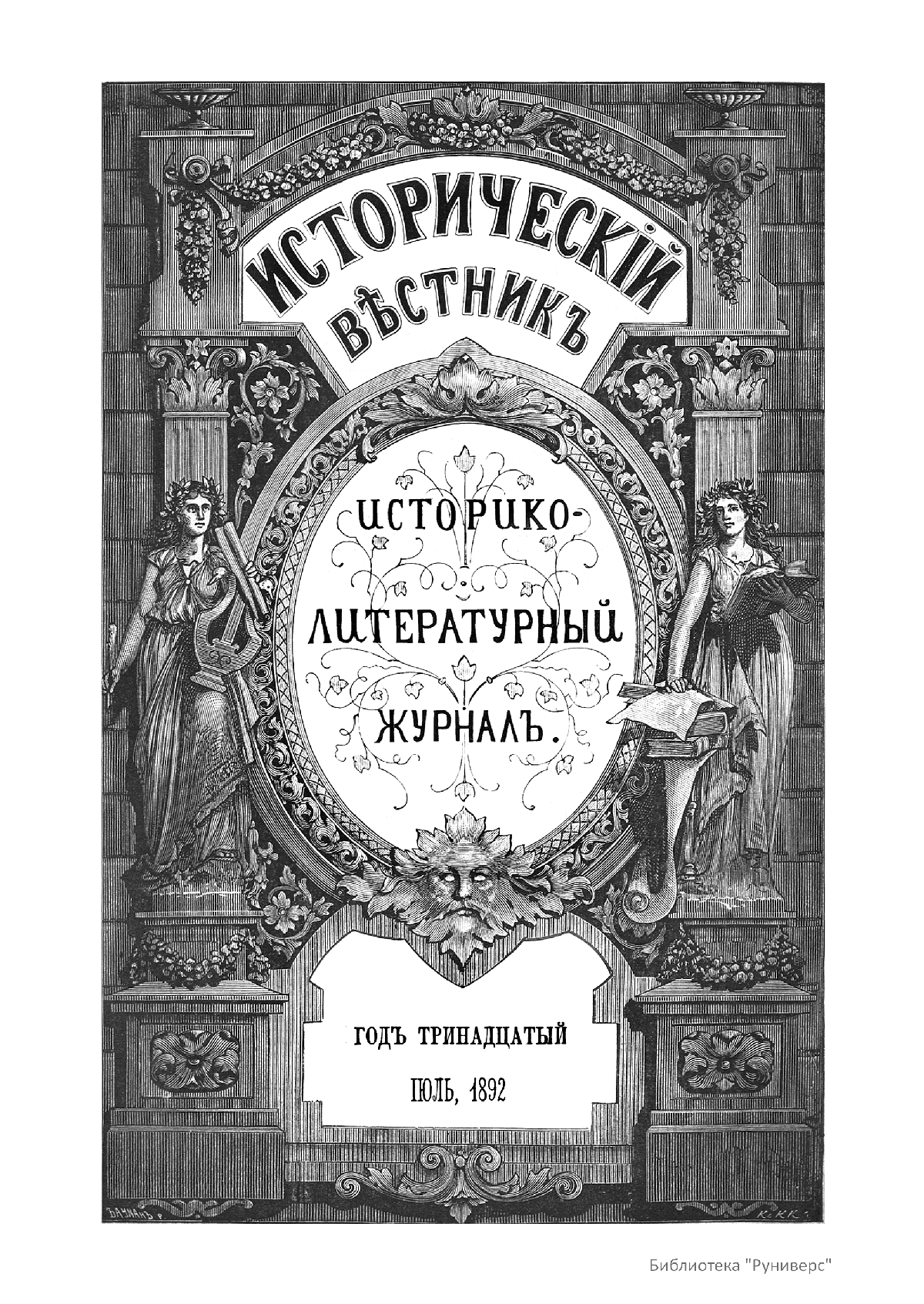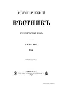 «Исторический вестник» - русский ежемесячный историко-литературный журнал. Издавался в Санкт-Петербурге с 1880-го по 1917 г. Журнал был основан А.С. Сувориным и С.Н. Шубинским с целью «знакомить читателей в живой, общедоступной форме с современным состоянием исторической науки и литературы в России и Европе». Вышло 150 тт. Каждый том состоял из трёх ежемесячных выпусков, имел свою нумерацию страниц, оглавление, список иллюстраций. Журнал приобрёл устойчивую популярность среди читателей, заняв прочное место в «триумвирате» русских исторических журналов наряду с «Русским архивом» и «Русской стариной». опережая их по количеству подписчиков. Отличием «Исторического вестника» было то, что он не помещал на своих страницах необработанных, сырых материалов. С другой стороны, журнал приближался по своему типу к журналам общелитературного образца, сочетая в себе коммерческий успех и доступное изложение материала.