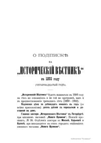 «Исторический вестник» - русский ежемесячный историко-литературный журнал. Издавался в Санкт-Петербурге с 1880-го по 1917 г. Журнал был основан А.С. Сувориным и С.Н. Шубинским с целью «знакомить читателей в живой, общедоступной форме с современным состоянием исторической науки и литературы в России и Европе». Вышло 150 тт. Каждый том состоял из трёх ежемесячных выпусков, имел свою нумерацию страниц, оглавление, список иллюстраций. Журнал приобрёл устойчивую популярность среди читателей, заняв прочное место в «триумвирате» русских исторических журналов наряду с «Русским архивом» и «Русской стариной». опережая их по количеству подписчиков. Отличием «Исторического вестника» было то, что он не помещал на своих страницах необработанных, сырых материалов. С другой стороны, журнал приближался по своему типу к журналам общелитературного образца, сочетая в себе коммерческий успех и доступное изложение материала.