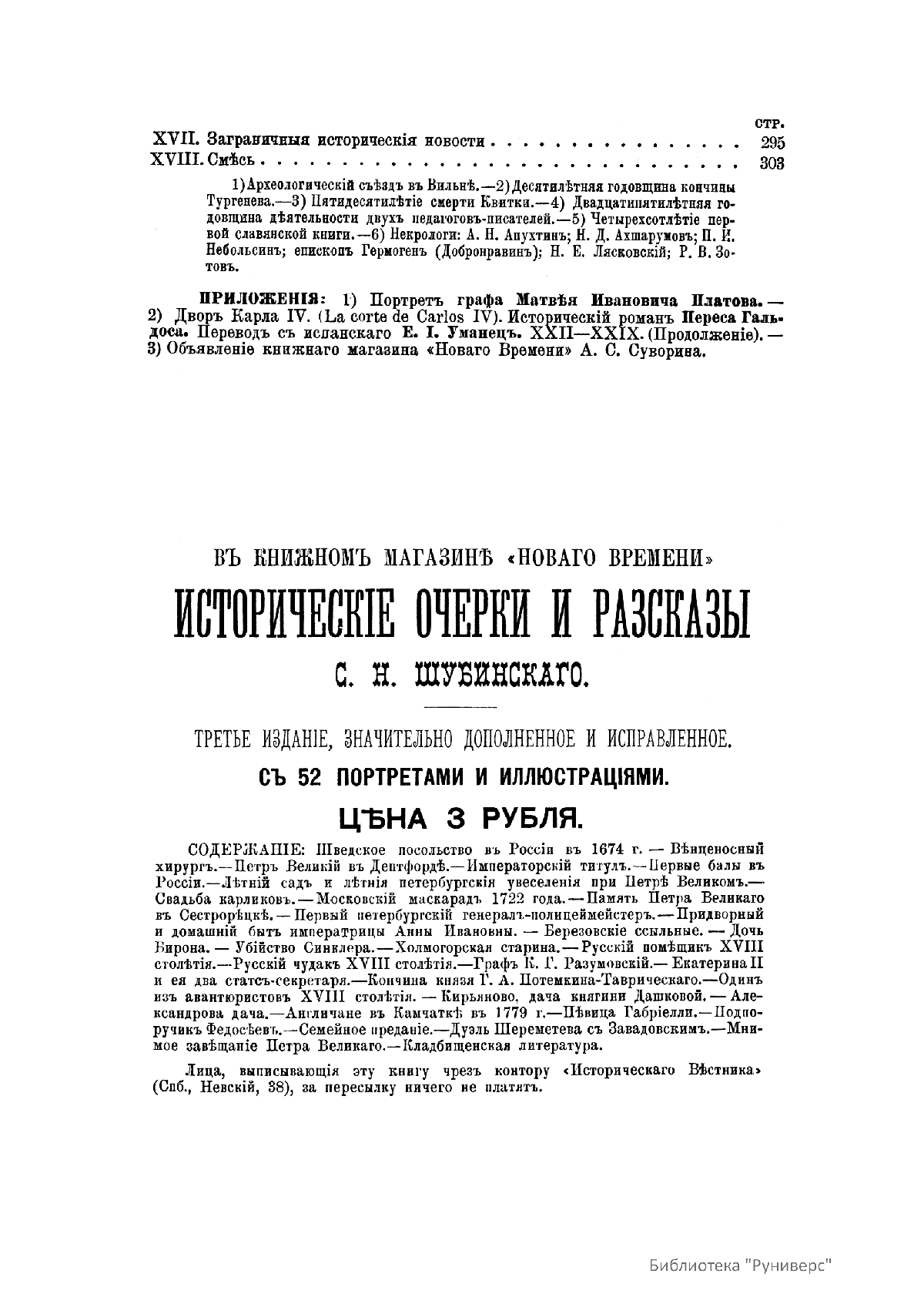 «Исторический вестник» - русский ежемесячный историко-литературный журнал. Издавался в Санкт-Петербурге с 1880-го по 1917 г. Журнал был основан А.С. Сувориным и С.Н. Шубинским с целью «знакомить читателей в живой, общедоступной форме с современным состоянием исторической науки и литературы в России и Европе». Вышло 150 тт. Каждый том состоял из трёх ежемесячных выпусков, имел свою нумерацию страниц, оглавление, список иллюстраций. Журнал приобрёл устойчивую популярность среди читателей, заняв прочное место в «триумвирате» русских исторических журналов наряду с «Русским архивом» и «Русской стариной». опережая их по количеству подписчиков. Отличием «Исторического вестника» было то, что он не помещал на своих страницах необработанных, сырых материалов. С другой стороны, журнал приближался по своему типу к журналам общелитературного образца, сочетая в себе коммерческий успех и доступное изложение материала.