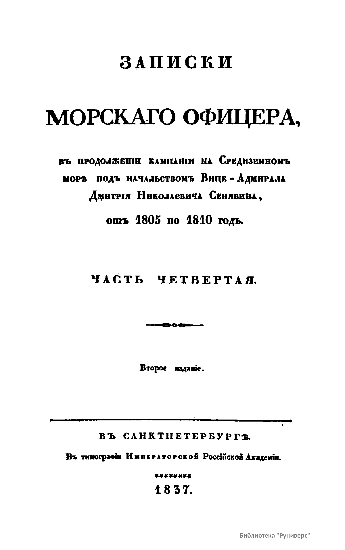 Записки морскаго офицера, въ продолженiи кампанiи на Средиземномъ морѣ подъ начальствомъ Вице-Адмирала Дмитрiя Николаевича Сенявина отъ 1805 по 1810 годъ. Часть четвертая