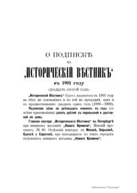 «Исторический вестник» - русский ежемесячный историко-литературный журнал. Издавался в Санкт-Петербурге с 1880-го по 1917 г. Журнал был основан А.С. Сувориным и С.Н. Шубинским с целью «знакомить читателей в живой, общедоступной форме с современным состоянием исторической науки и литературы в России и Европе». Вышло 150 тт. Каждый том состоял из трёх ежемесячных выпусков, имел свою нумерацию страниц, оглавление, список иллюстраций. Журнал приобрёл устойчивую популярность среди читателей, заняв прочное место в «триумвирате» русских исторических журналов наряду с «Русским архивом» и «Русской стариной». опережая их по количеству подписчиков. Отличием «Исторического вестника» было то, что он не помещал на своих страницах необработанных, сырых материалов. С другой стороны, журнал приближался по своему типу к журналам общелитературного образца, сочетая в себе коммерческий успех и доступное изложение материала.