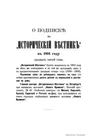 «Исторический вестник» - русский ежемесячный историко-литературный журнал. Издавался в Санкт-Петербурге с 1880-го по 1917 г. Журнал был основан А.С. Сувориным и С.Н. Шубинским с целью «знакомить читателей в живой, общедоступной форме с современным состоянием исторической науки и литературы в России и Европе». Вышло 150 тт. Каждый том состоял из трёх ежемесячных выпусков, имел свою нумерацию страниц, оглавление, список иллюстраций. Журнал приобрёл устойчивую популярность среди читателей, заняв прочное место в «триумвирате» русских исторических журналов наряду с «Русским архивом» и «Русской стариной». опережая их по количеству подписчиков. Отличием «Исторического вестника» было то, что он не помещал на своих страницах необработанных, сырых материалов. С другой стороны, журнал приближался по своему типу к журналам общелитературного образца, сочетая в себе коммерческий успех и доступное изложение материала.