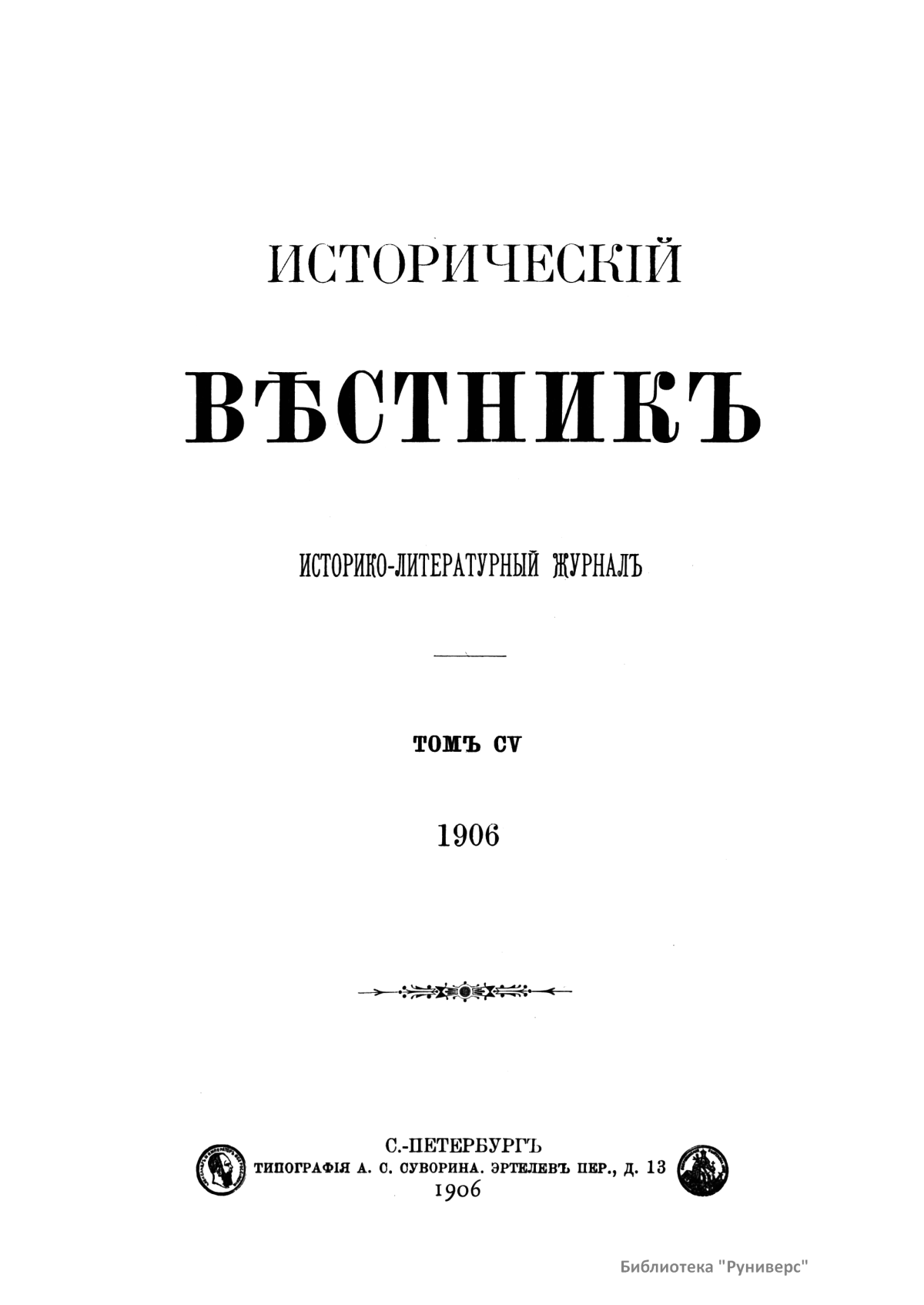 Историческiй вѣстникъ. Историко-литературный журналъ. Томъ CV