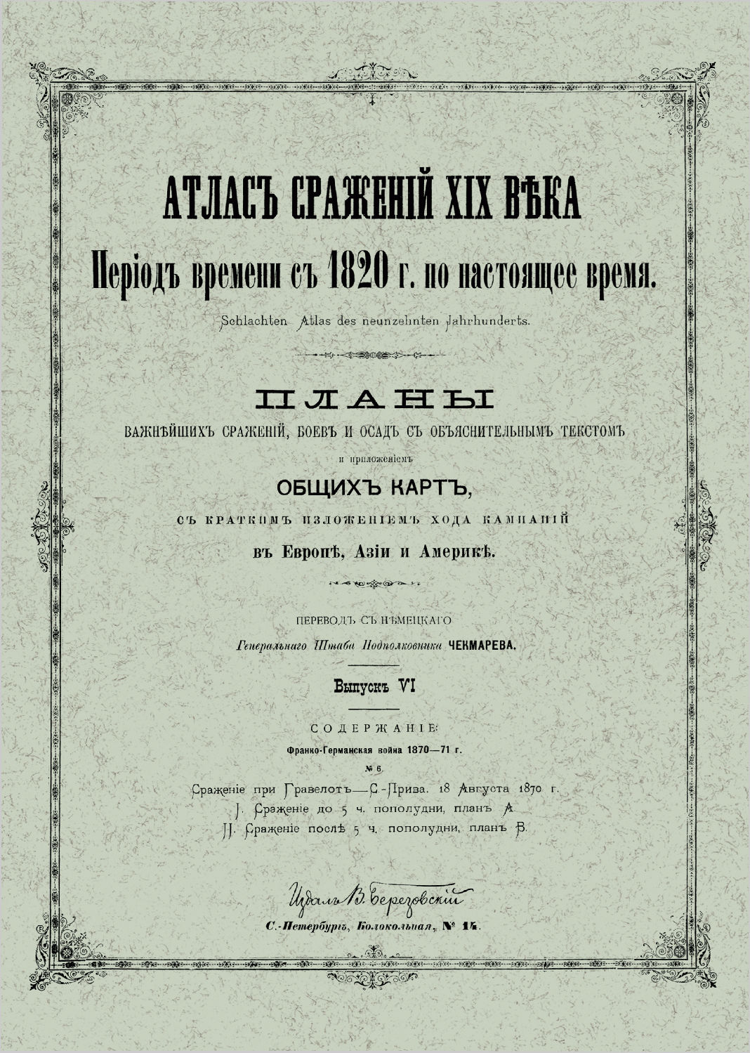 Второе издание «Атласа сражений XIX века» в 20-ти выпусках, представляет собой перевод на русский язык, выпускавшегося в военно-научном комитете Главного штаба на немецком языке с 1830-х гг., разрозненного собрания карт и планов военных кампаний армий мира в XIX века. Переводчиком данного издания является Виктор Иванович Чекмарев (1861–1939) — генерал-лейтенант (1912), видный военный деятель российской императорской армии, историк, участник Первой мировой войны и белого движения на юге России, впоследствии в эмиграции. С 1894 г., занимая должность делопроизводителя, а затем столоначальника канцелярии военно-ученого комитета Главного Штаба, подполковник Генерального Штаба Чекмарев, в результате кропотливой работы собрал воедино «Атлас сражений XIX века», каждый выпуск которого посвящен одной или нескольким военным кампаниям Европы, Азии и Америки, содержит подробное описание расположения войск и хода боевых действий противников, хронологию событий, снабжен картами и планами сражений. Это издание имеет большую историко-культурную ценность, интересно как ученым-историкам, так и любителям военно-исторической литературы.