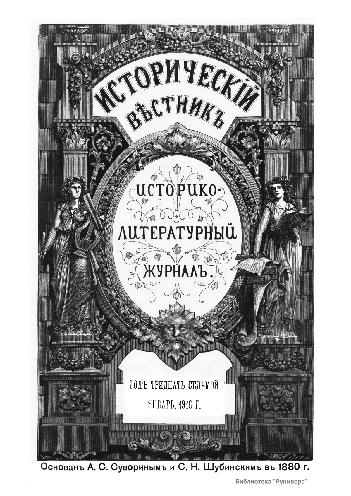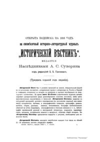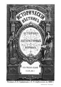 «Исторический вестник» - русский ежемесячный историко-литературный журнал. Издавался в Санкт-Петербурге с 1880-го по 1917 г. Журнал был основан А.С. Сувориным и С.Н. Шубинским с целью «знакомить читателей в живой, общедоступной форме с современным состоянием исторической науки и литературы в России и Европе». Вышло 150 тт. Каждый том состоял из трёх ежемесячных выпусков, имел свою нумерацию страниц, оглавление, список иллюстраций. Журнал приобрёл устойчивую популярность среди читателей, заняв прочное место в «триумвирате» русских исторических журналов наряду с «Русским архивом» и «Русской стариной». опережая их по количеству подписчиков. Отличием «Исторического вестника» было то, что он не помещал на своих страницах необработанных, сырых материалов. С другой стороны, журнал приближался по своему типу к журналам общелитературного образца, сочетая в себе коммерческий успех и доступное изложение материала.