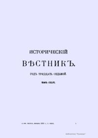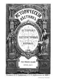 «Исторический вестник» - русский ежемесячный историко-литературный журнал. Издавался в Санкт-Петербурге с 1880-го по 1917 г. Журнал был основан А.С. Сувориным и С.Н. Шубинским с целью «знакомить читателей в живой, общедоступной форме с современным состоянием исторической науки и литературы в России и Европе». Вышло 150 тт. Каждый том состоял из трёх ежемесячных выпусков, имел свою нумерацию страниц, оглавление, список иллюстраций. Журнал приобрёл устойчивую популярность среди читателей, заняв прочное место в «триумвирате» русских исторических журналов наряду с «Русским архивом» и «Русской стариной». опережая их по количеству подписчиков. Отличием «Исторического вестника» было то, что он не помещал на своих страницах необработанных, сырых материалов. С другой стороны, журнал приближался по своему типу к журналам общелитературного образца, сочетая в себе коммерческий успех и доступное изложение материала.